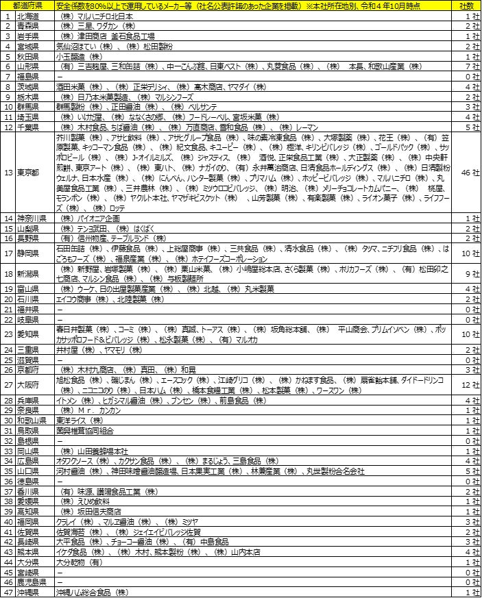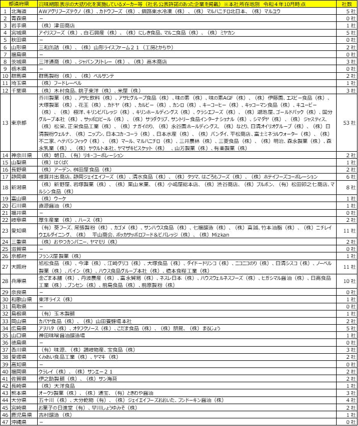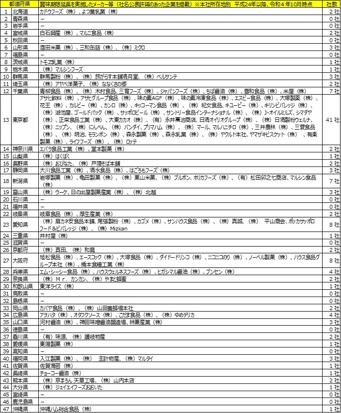 平成24年以降に賞味期限を延長したメーカー等一覧 2022年10月現在