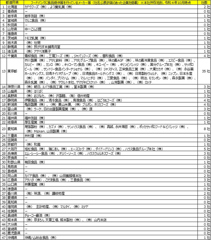 フードバンクに食品を提供等行っている事業者(食品メーカー等) 2022年10月現在