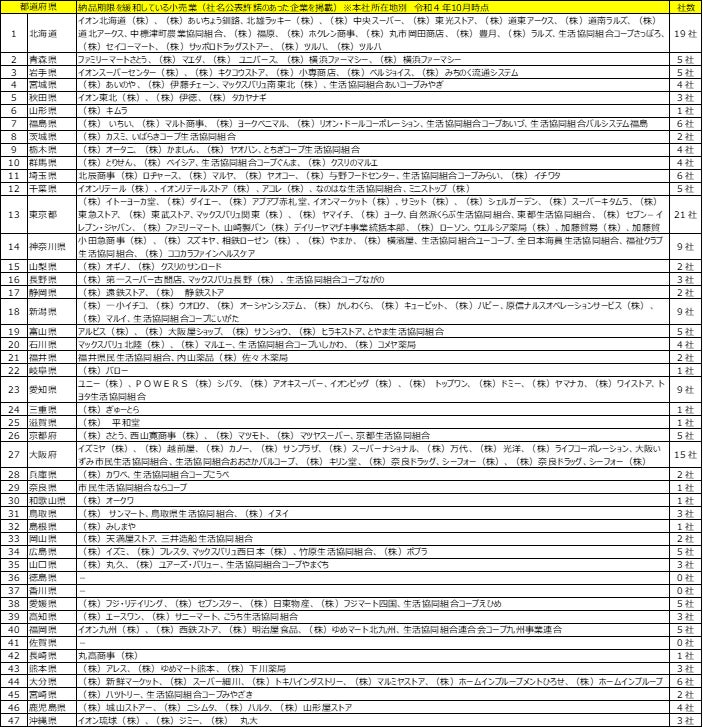 食品ロス削減のための商慣習見直し検討ワーキングチームではこの納品期限の緩和に取り組んでおり、食品ロス削減という社会的責任から、取り組む小売業も増えており、前年から54社増加となりました。下記には令和4年10月時点の取り組み事業者を本社所在地別に掲載しています。