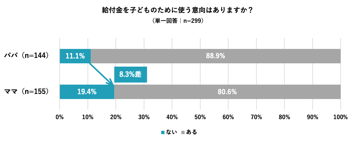 給付金の使い道として、購入したいモノ・サービスについてを聞いたところ、「給付金を子どものために使う意向はない」と回答したのは、パパが11.1%、ママが19.4%となり、その差は8.3%となりました。
