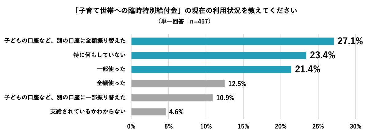 0~1歳の子どもがいるパパ・ママ457人に、「子育て世帯への臨時特別給付金(以下、給付金)」の利用状況についてを質問したところ、1位「子どもの口座など、別の口座に全額を振り替えた」(27.1%)、2位「特に何もしていない」(23.4%)、3位「一部使った」(21.4%)となりました。