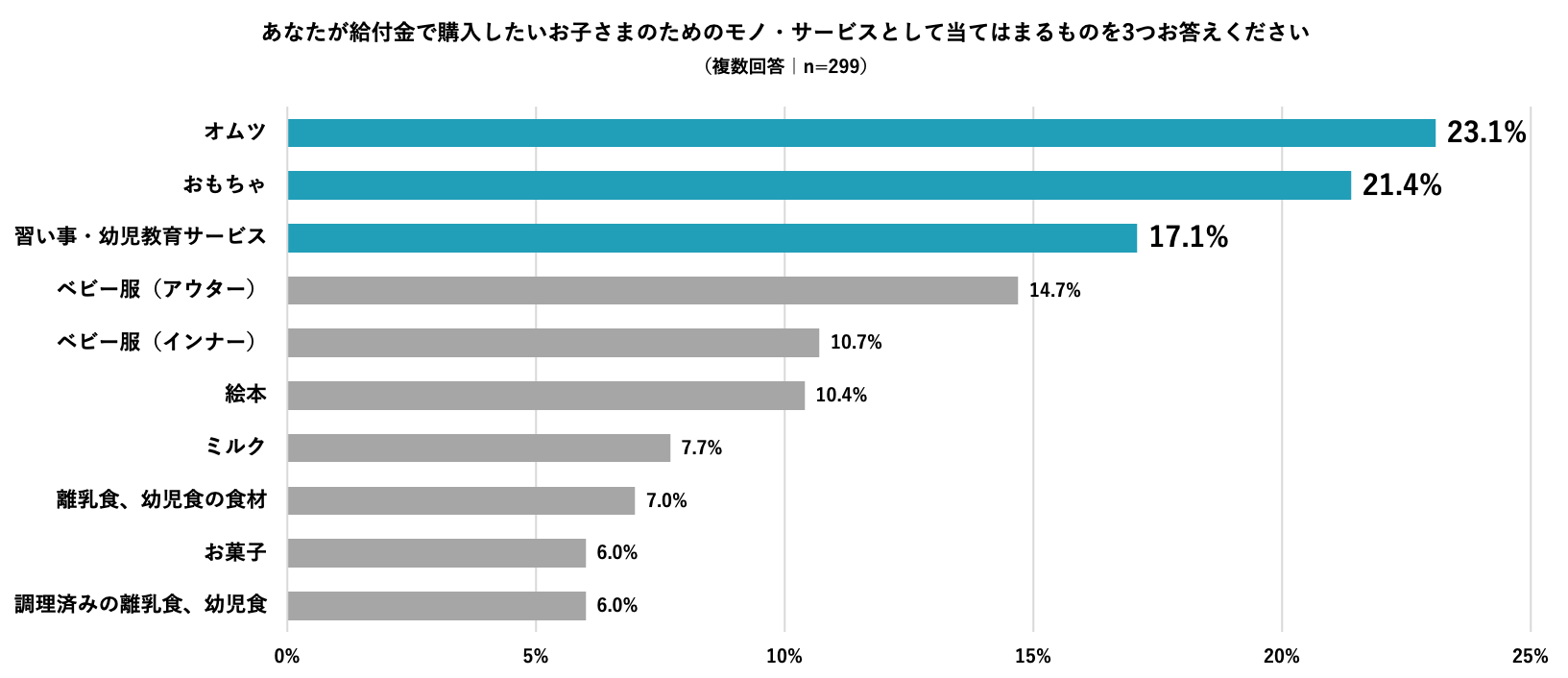 給付金で購入したいモノ・サービスについてを質問したところ、1位「オムツ」(23.1%)、2位「おもちゃ」(21.4%)、3位「習い事・幼児教育サービス」(17.1%)となりました。