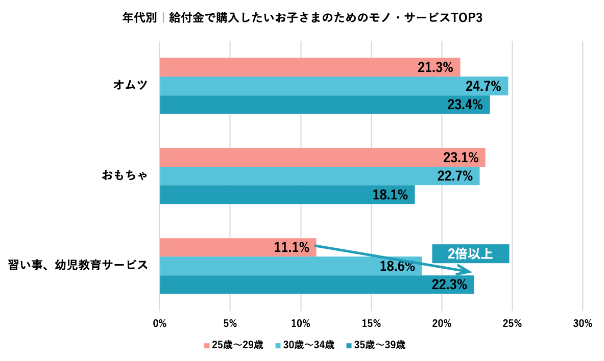また、TOP3の利用意向を年代別に見ると、1位の「オムツ」、2位の「おもちゃ」への利用意向については年代間での大きな変化は見受けられませんでしたが、3位の「習い事・幼児教育サービス」への利用意向については、30代後半が22.3%と最も多く、次いで30代前半が18.6%、20代後半が11.1%となり、20代後半と30代後半で比較すると約2倍以上の差がありました。