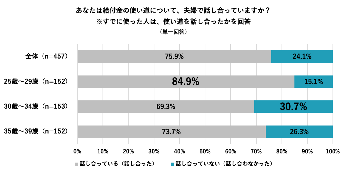 給付金の使い道について夫婦で話し合いをしているか(すでに使った人は使い道を話し合ったか)を質問したところ、75.9%が「話し合っている(話しあった)」、24.1%が「話し合っていない(話し合わなかった)」と回答しました。年代別に「話し合っていない(話し合わなかった)」割合を見ると、30代前半(30~34歳)が30.7%で最多回答となりました。