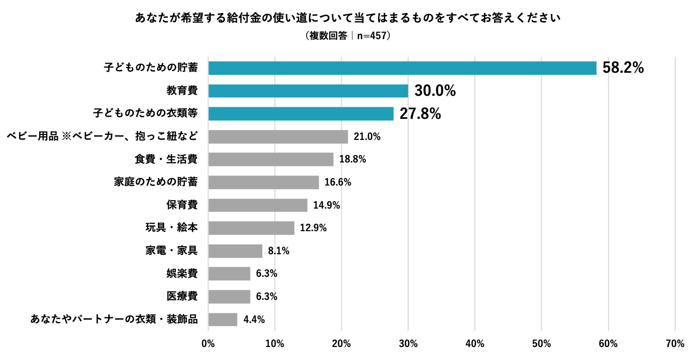 希望する給付金の使い道についてを質問したところ、1位「子どものための貯蓄」(58.2%)、2位「教育費」(30.0%)、3位「子どものための衣類等」(27.8%)となりました。