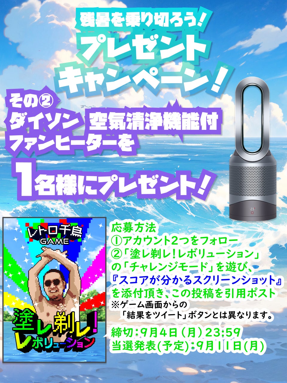 本キャンペーンでは、SBI e-Sportsとレイクの公式X(旧Twitter)アカウントをフォローの上、指定のキャンペーン投稿をリポスト頂くと、抽選で3名様にAmazonギフトカード1万円分を、また、「塗レ剃レ!レボリューション」のチャレンジモードで遊んだ結果のスコアが分かるスクリーンショット画像を添付して指定のキャンペーン投稿を引用ポストいただくと、抽選で1名様にダイソン・ピュア ホット アンド クール リンク 空気清浄機能付ファンヒーターをプレゼントいたします。