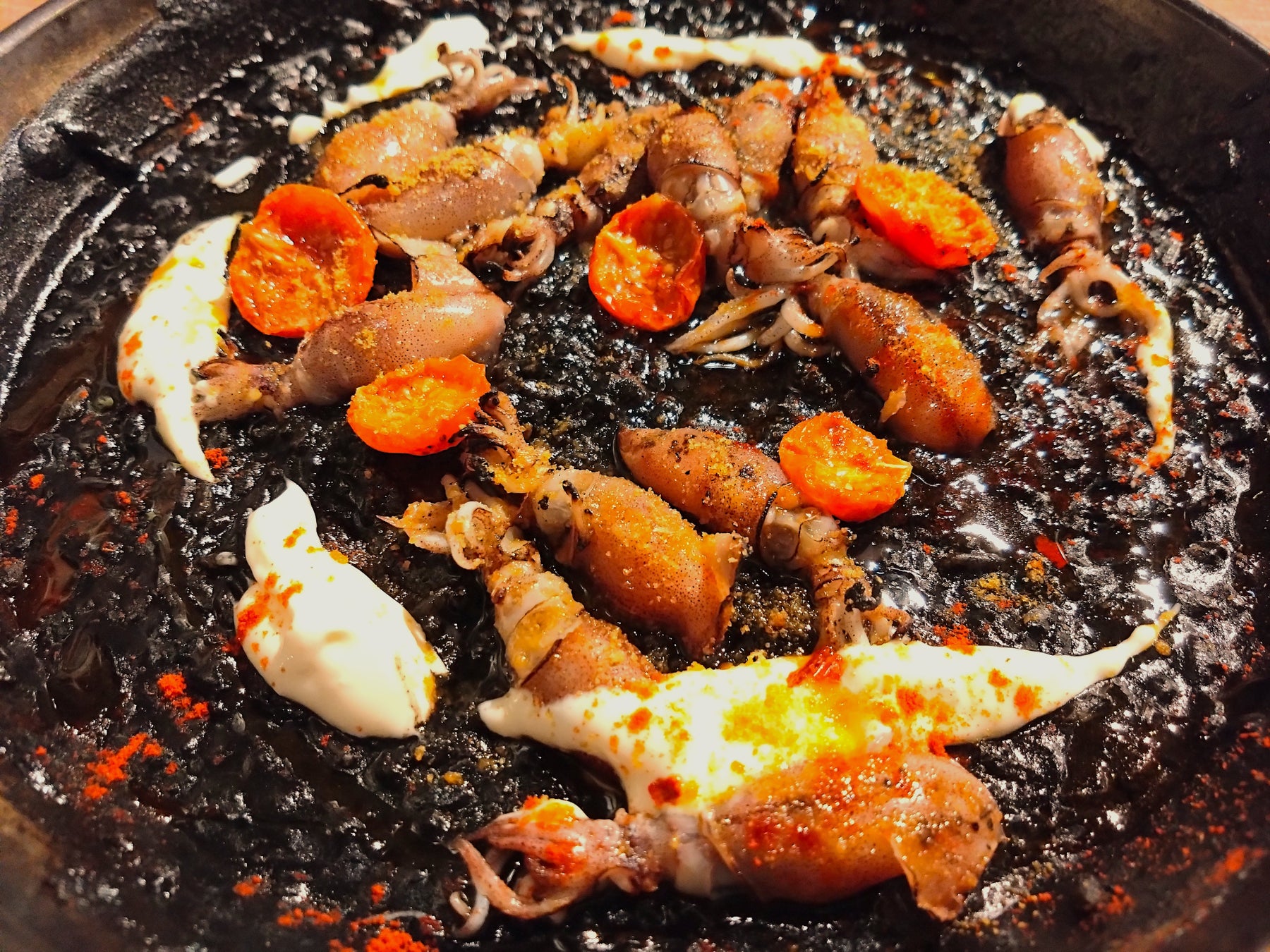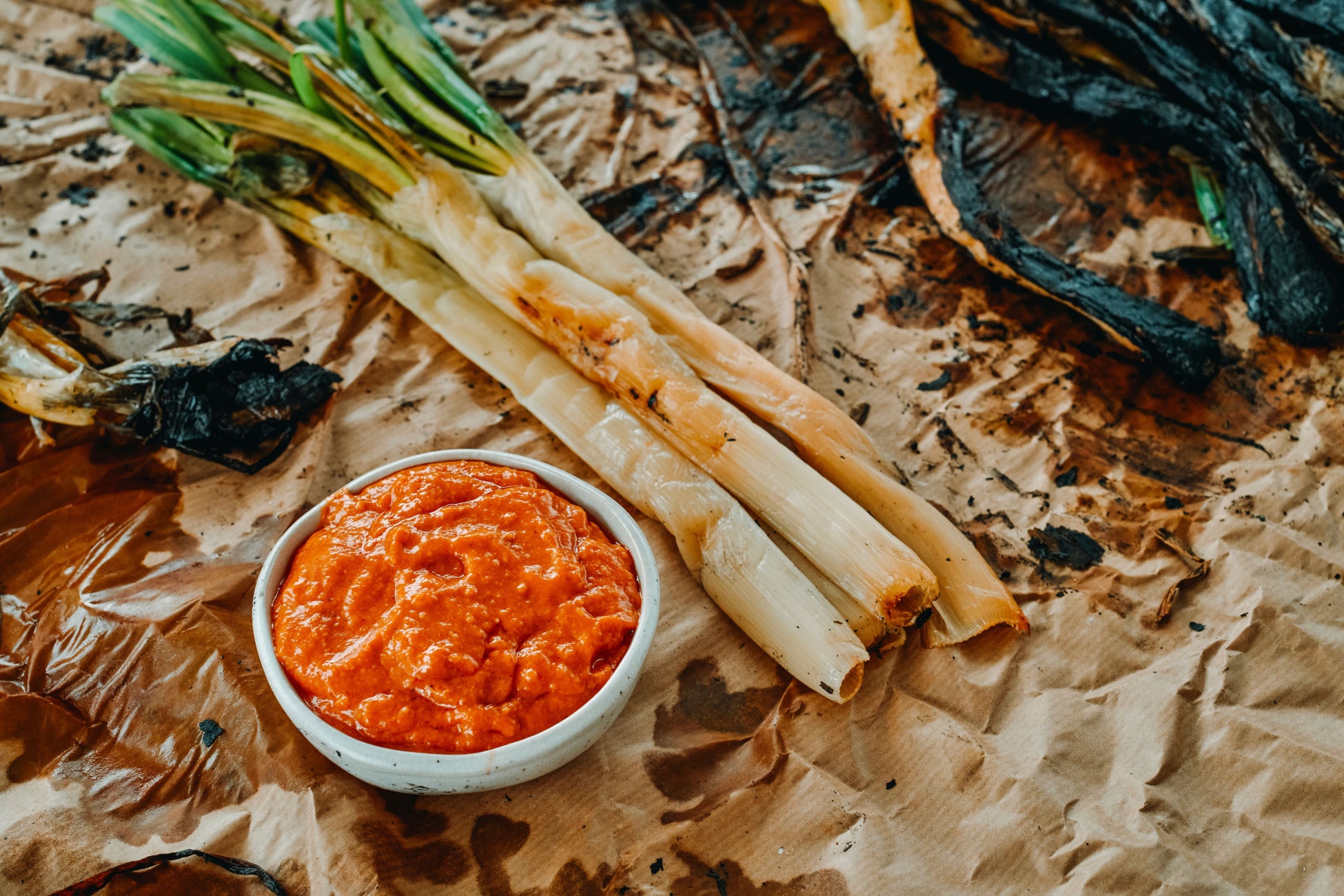カタルーニャ地方で食べられる冬の風物詩、炭火で真っ黒に焼き上げたねぎを蒸らして剣を抜くようにしてとろとろに焼きあがったねぎを引き抜きます。オリジナルのロメスコソースに付けてお召し上がりください。
