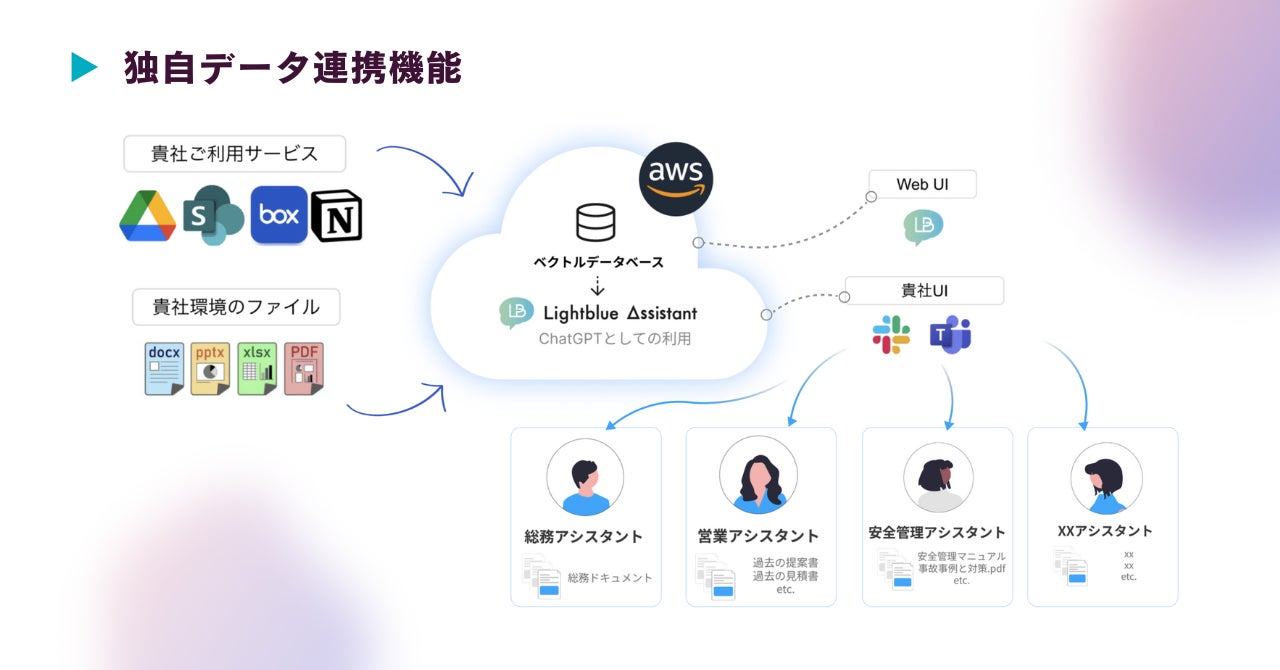 そこでLightblue Assistantでは、個別にカスタマイズしたAIチャットサービスを簡単に構築できる新機能「マイアシスタント」をリリースしました。また、自社のデータを円滑に取り込むことができる「独自データ連携機能」のアップデートも行いました。