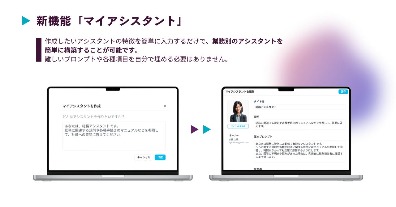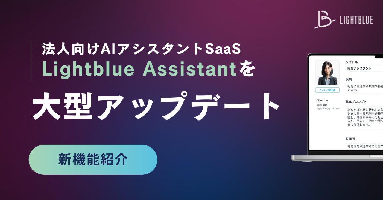 東京大学発、最先端アルゴリズムの現場実装に取り組むAIスタートアップ 株式会社Lightblue(代表取締役:園田亜斗夢、本社:東京都千代田区、以下「Lightblue」)は法人向けAIアシスタントSaaS「Lightblue Assistant」において、幅広い業務や高い専門性に対応するべく、新機能「マイアシスタント」のリリース及び「独自データ連携機能」のアップデートを行いました。