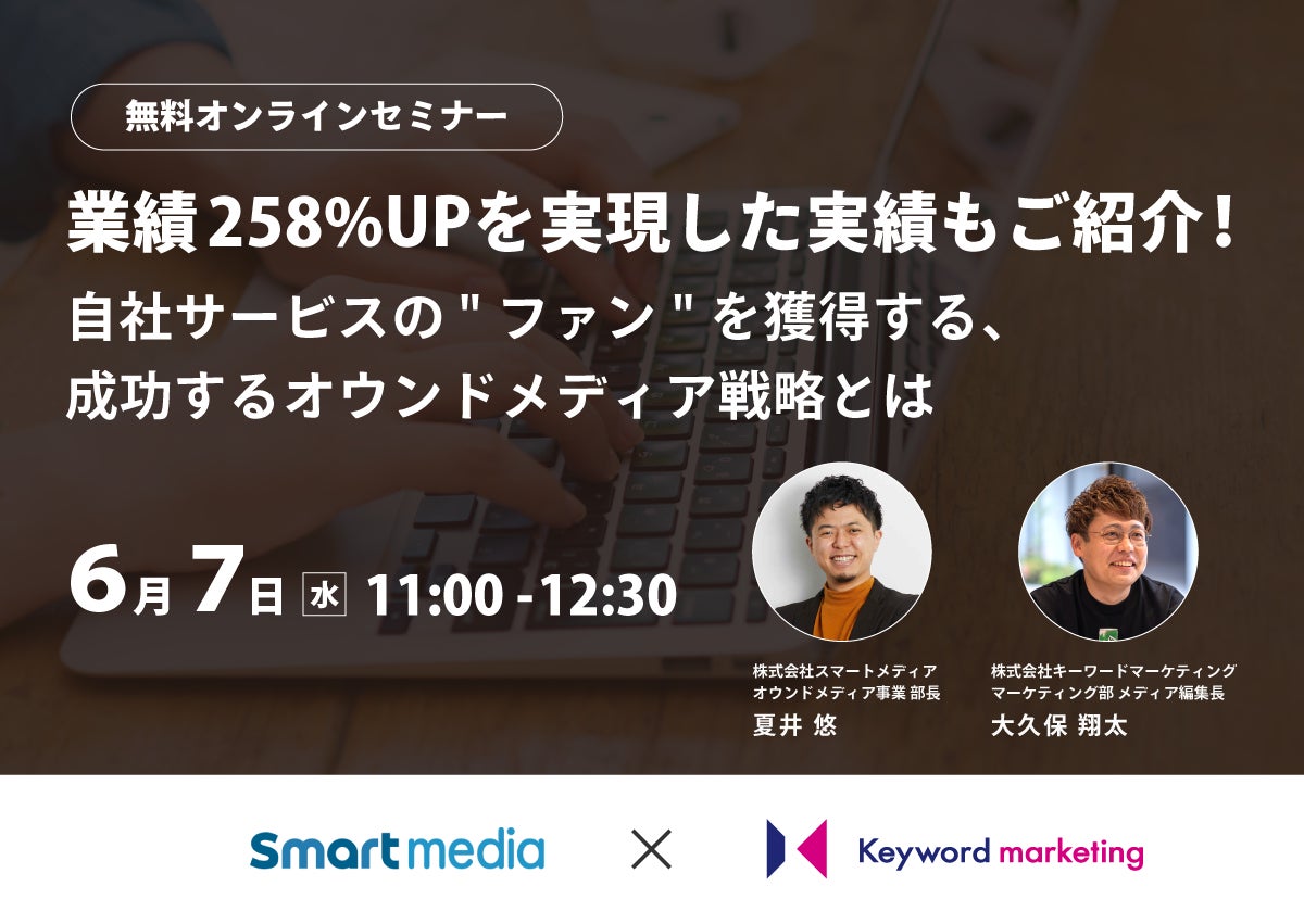 本セミナーでは、互いにオウンドメディアにおける支援サービスを提供しているスマートメディアと、自社メディアでコンテンツを発信しているキーワードマーケティングの共同開催で、「成功するオウンドメディア戦略とは」というテーマのもと、オウンドメディアを成功させるための具体的な方法について、事例をもとに解説します。