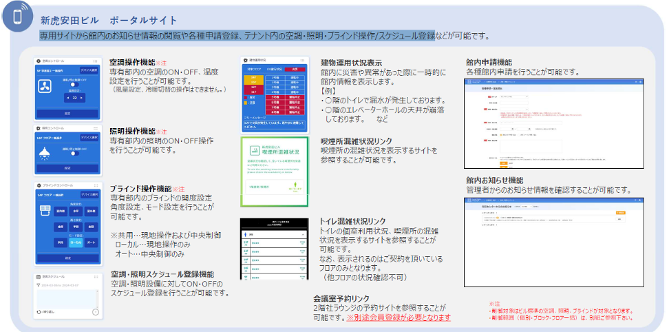 施設利用者とビル管理者が容易に連携できるよう、館内のお知らせ情報の閲覧や各種申請、テナント内の空調・照明・ブラインド操作を行うポータルサイトを開設予定です。今後、利用者の要望に応じて機能を拡充します。