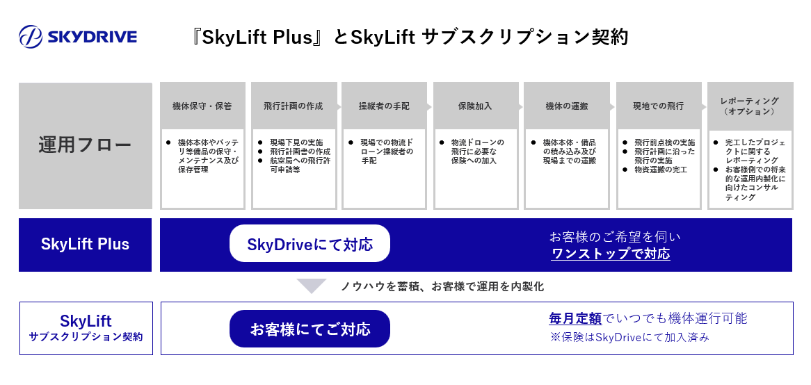 当社では、以前より物流ドローン『SkyLift』をサブスクリプション契約にて販売してまいりました。この度、「現場で活用したいが、運用ノウハウが無いため導入が進めにくい」「パイロットの手配が自社では難しい」といったお客様の声をきっかけに、同サービスを提供する運びとなりました。