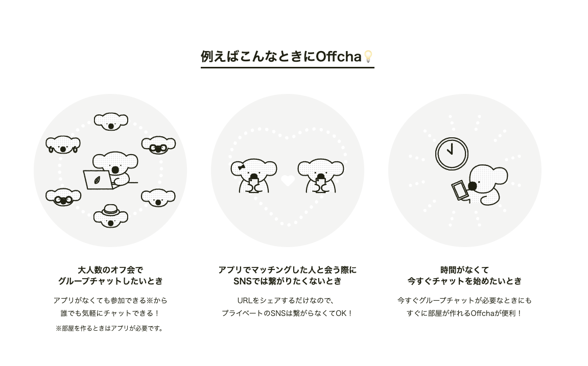 実際に「Offcha(オフチャ)」を利用しているユーザーにアンケート調査を行ったところ、上記のシーンで利用していることが多いと分かりました。その他にも、部活動での連絡など利用者にとって必要な使い方でご利用いただいてます。『自分だけの使い方』をぜひ見つけて、「Offcha(オフチャ)」を楽しんでみてください。