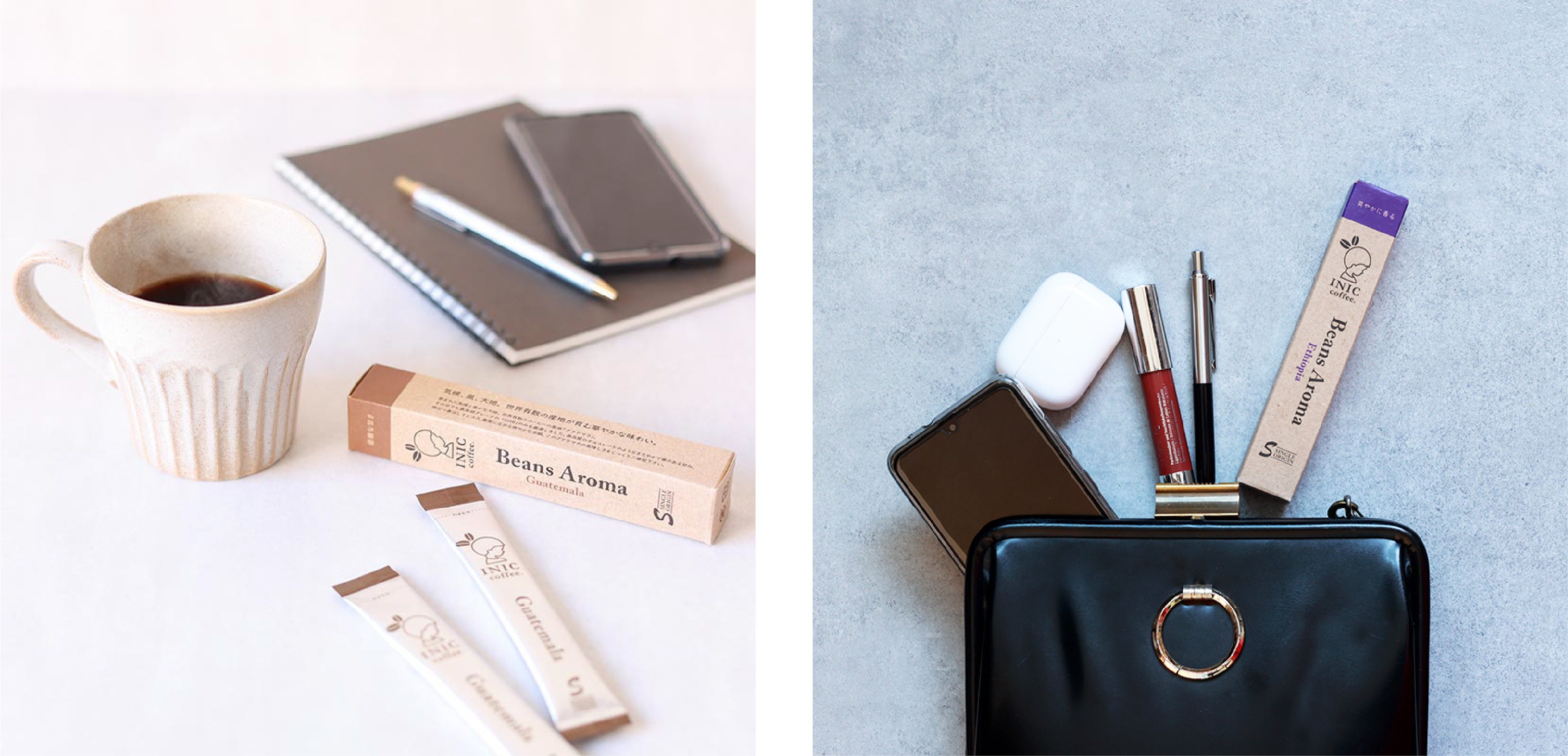 3つのうちからお気に入りの産地のコーヒーを、バッグやポーチにサッと入れて持ち歩くことができます。