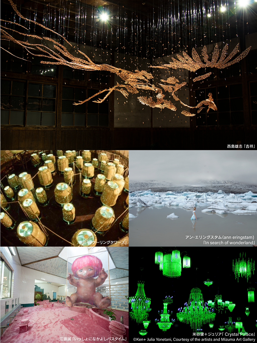 長年放置されていた建物を、地元住民や日本全国から集まる有志たちの手で清掃することから始め、国内外より集まるアーティスト達の手により各々の空間を作品へと変え、何年もの間、訪れる者もなく忘れ去られていた建物たちが、生き生きと輝きを取り戻し蘇るその様を、作品とともにお楽しみいただければ幸いです。