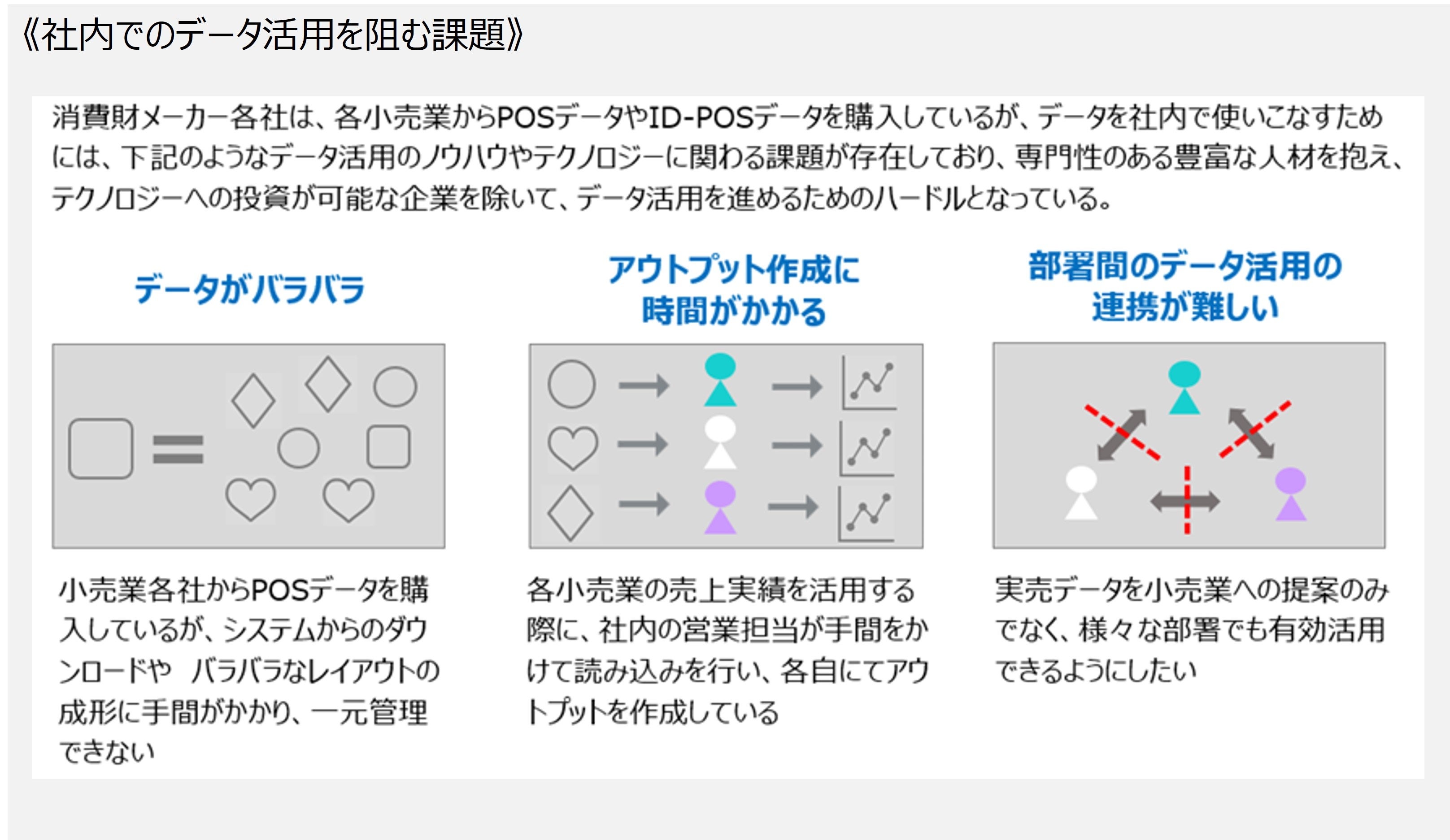 これまで消費財メーカーや流通業にとって、購買データ(POSデータ)を分析して商談やマーケティングにデータを活用したい、AIを用いて在庫や品揃えの最適化を図り廃棄やロスを削減して粗利を改善したいなど、データ活用に向けたニーズは大きい一方で、その前段階のデータ整備に関わる大量の作業が、企業のデジタルトランスフォーメーション(DX)を阻む社会的課題の一つでした。