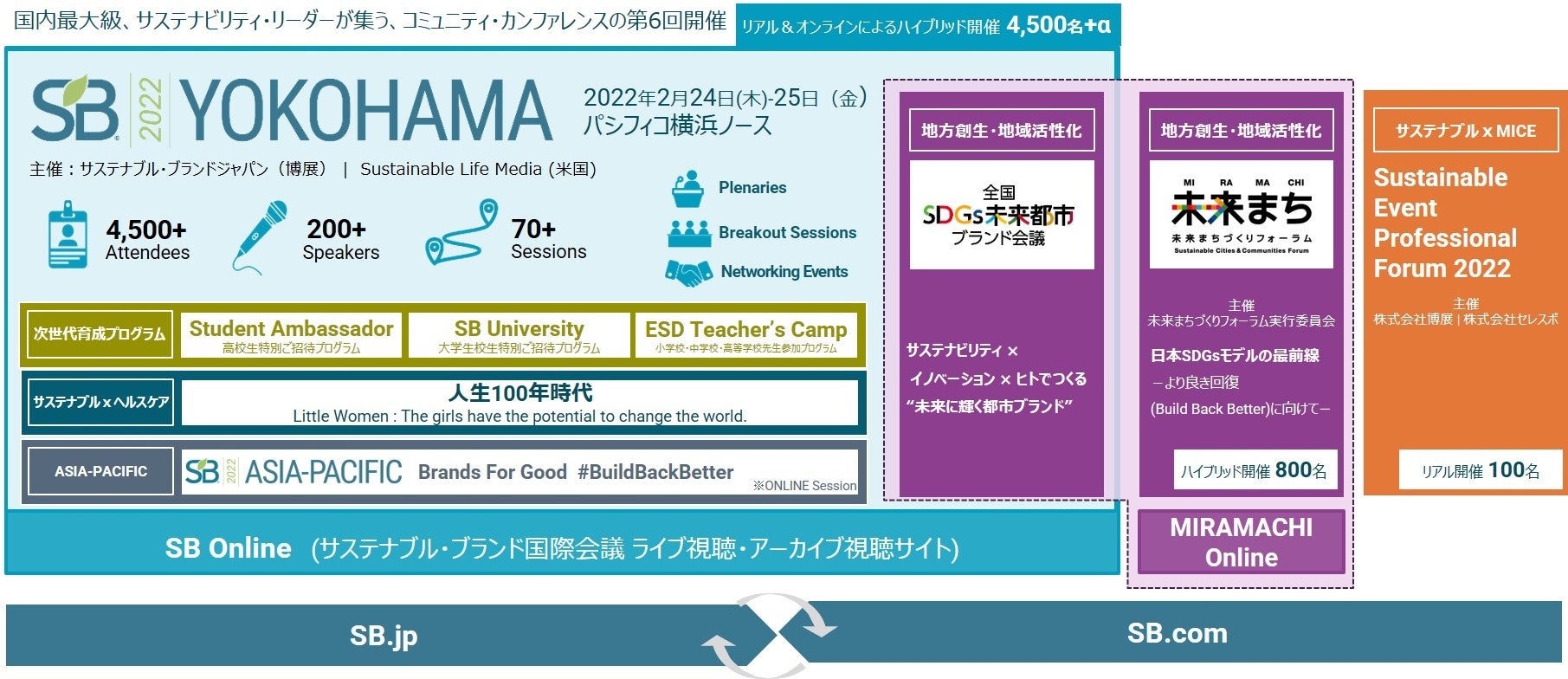 コミュニケーションの企画・デザインを通し、世界的なサステナビリティのムーブメントを国内で推進する株式会社 博展は、日本において6回目の開催となる「サステナブル・ブランド国際会議 2022 横浜(以下「SB 2022 横浜」)」を2022年2月24日(木)、25日(金)にパシフィコ横浜ノースとオンラインにてハイブリッド開催いたします。