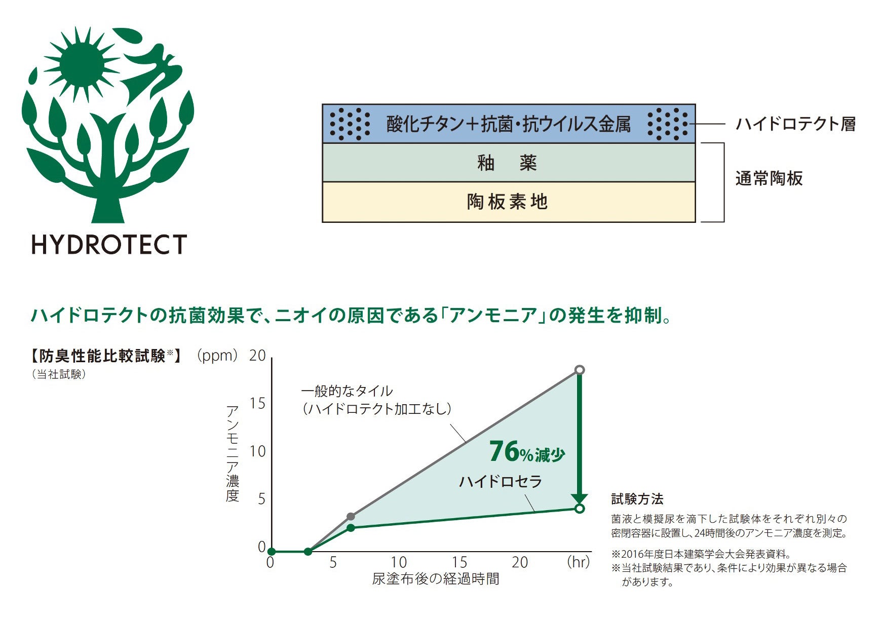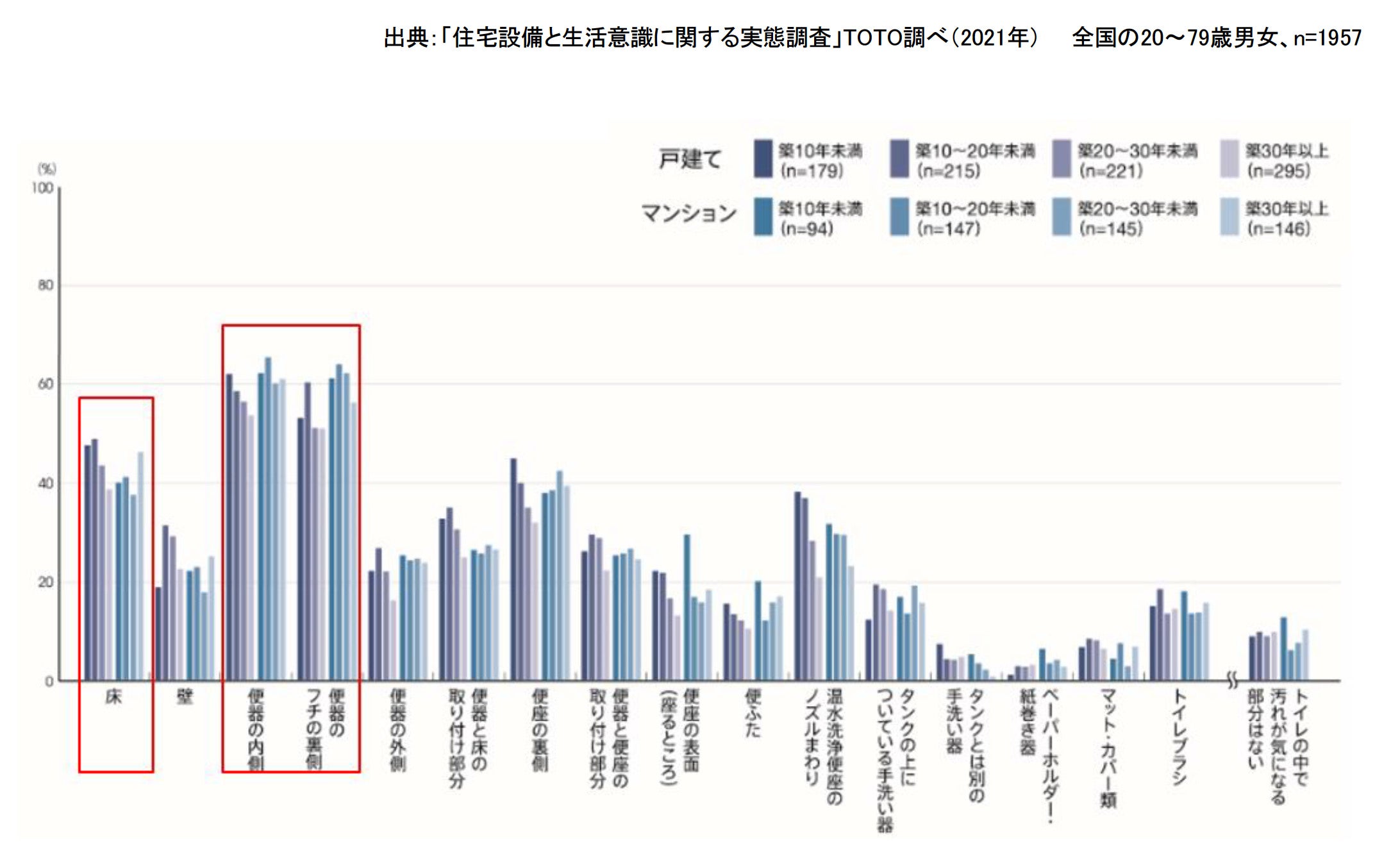 TOTOが全国の20~79歳の男女に行った「トイレの汚れで気になるところ」の調査(2021年)では、「便器の内側」「便器のフチの裏側」に続いて、「床」が3位となりました。「ハイドロセラ・トイレフロアJ」を活用することで、床まわりの防汚・防臭効果が見込まれます。
