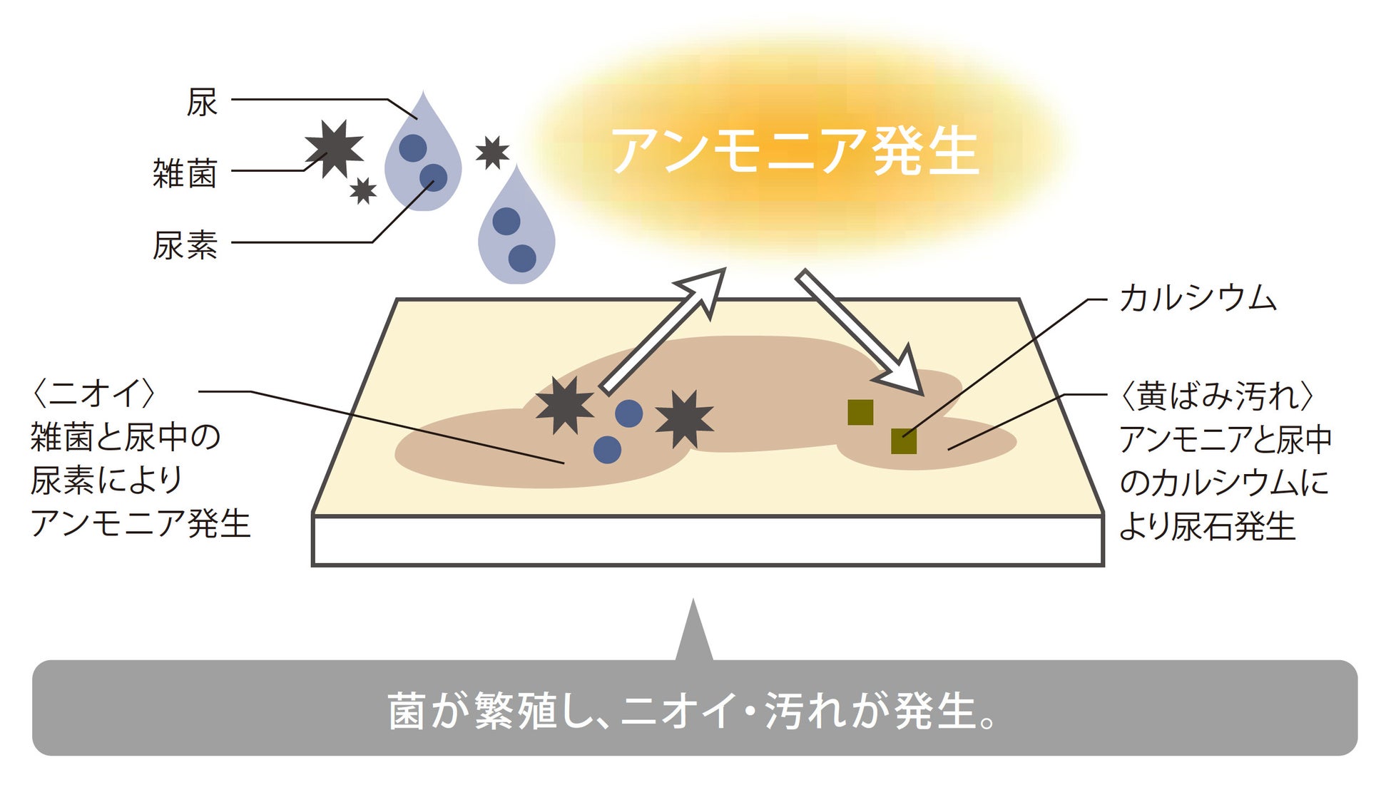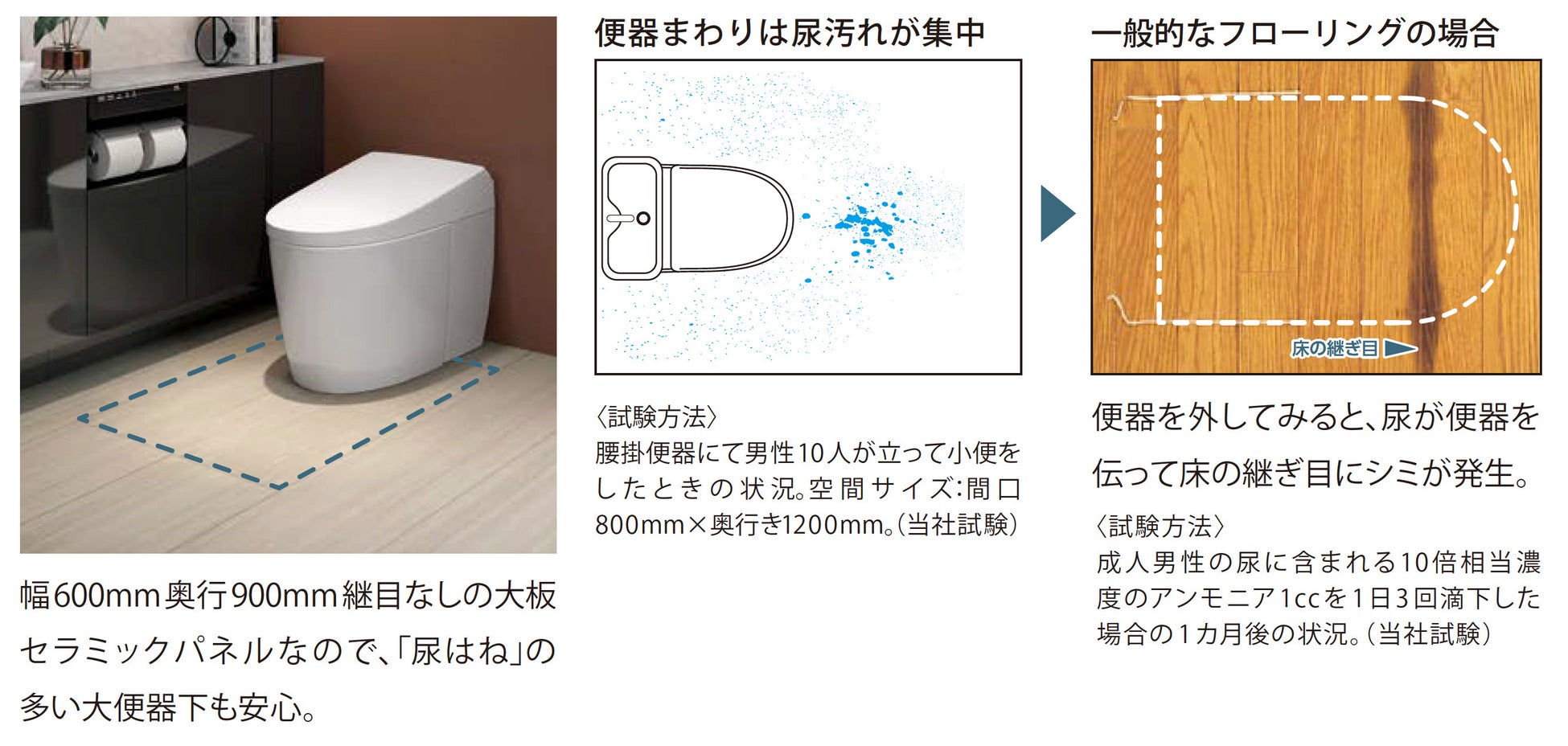 奥行600〜900mm×幅600mmの大判サイズのため、腰掛便器手前の尿垂れが集中するエリアをカバーできます。飛散した尿の目地への染み込みが少なくなるため、臭いや汚れの発生を防ぎます。