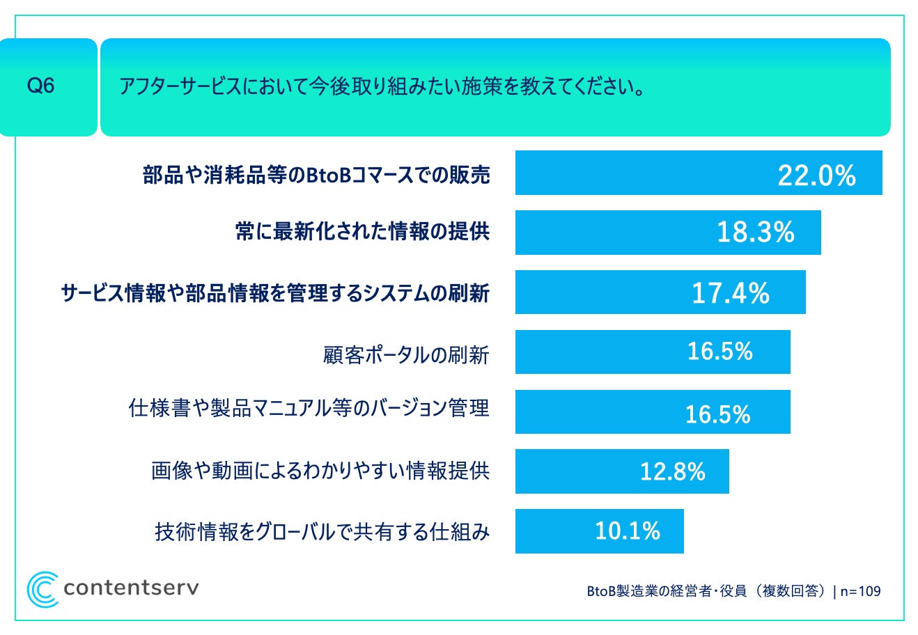 アフターサービスにおいて今後取り組みたい施策を尋ねたところ、部品や消耗品の情報を提供し、直接注文できるECサイトのリリースや、常に最新の情報を提供することができるポータルサイトの構築が挙げられています。