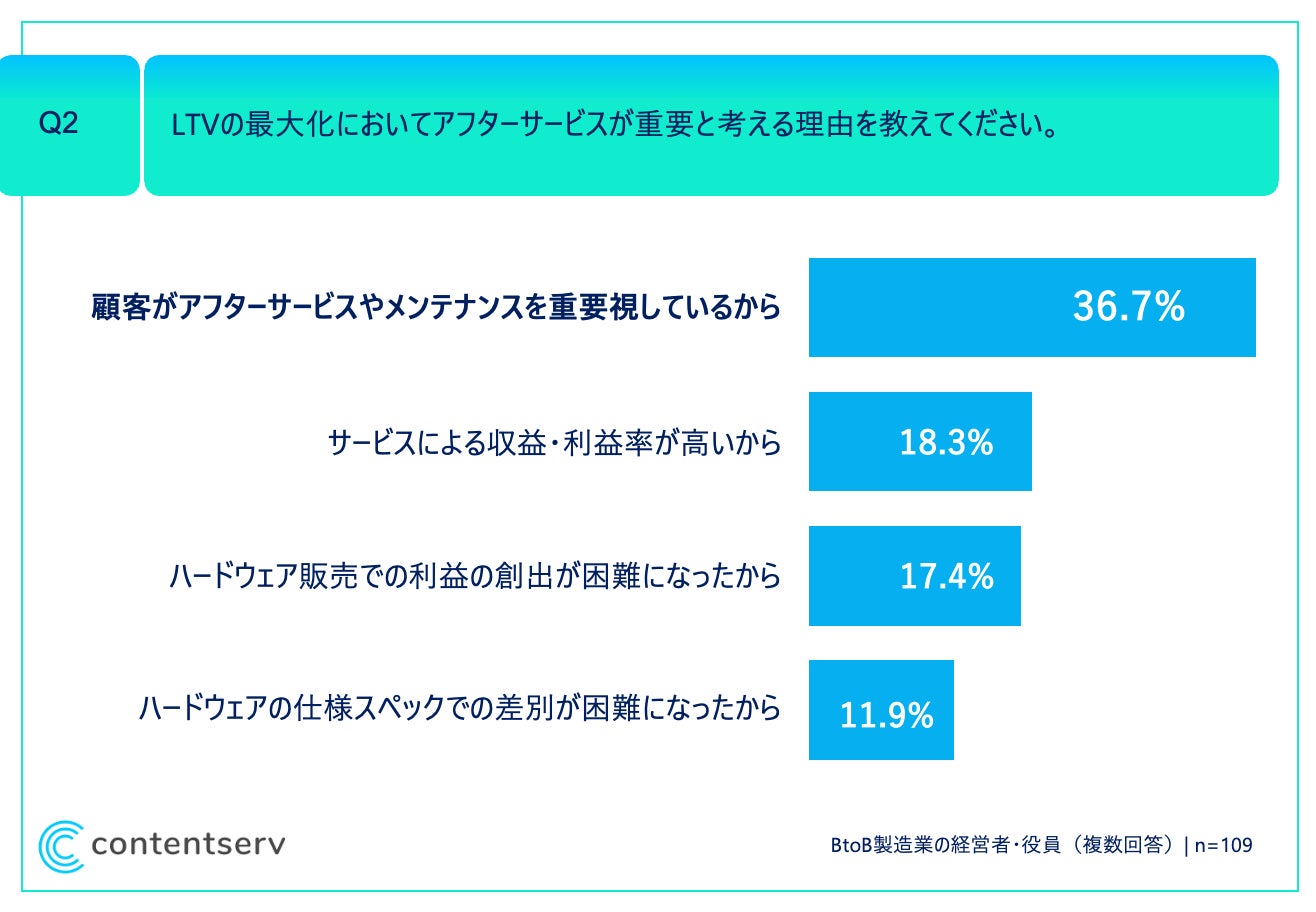 アフターサービスが重要と考える理由は、「顧客がアフターサービスやメンテナンスを重要視しているから」という回答が36.7%を占めました。製品購入後の持続的な品質維持やサポートサービスを重要視する顧客が多くなっていることを示しています。