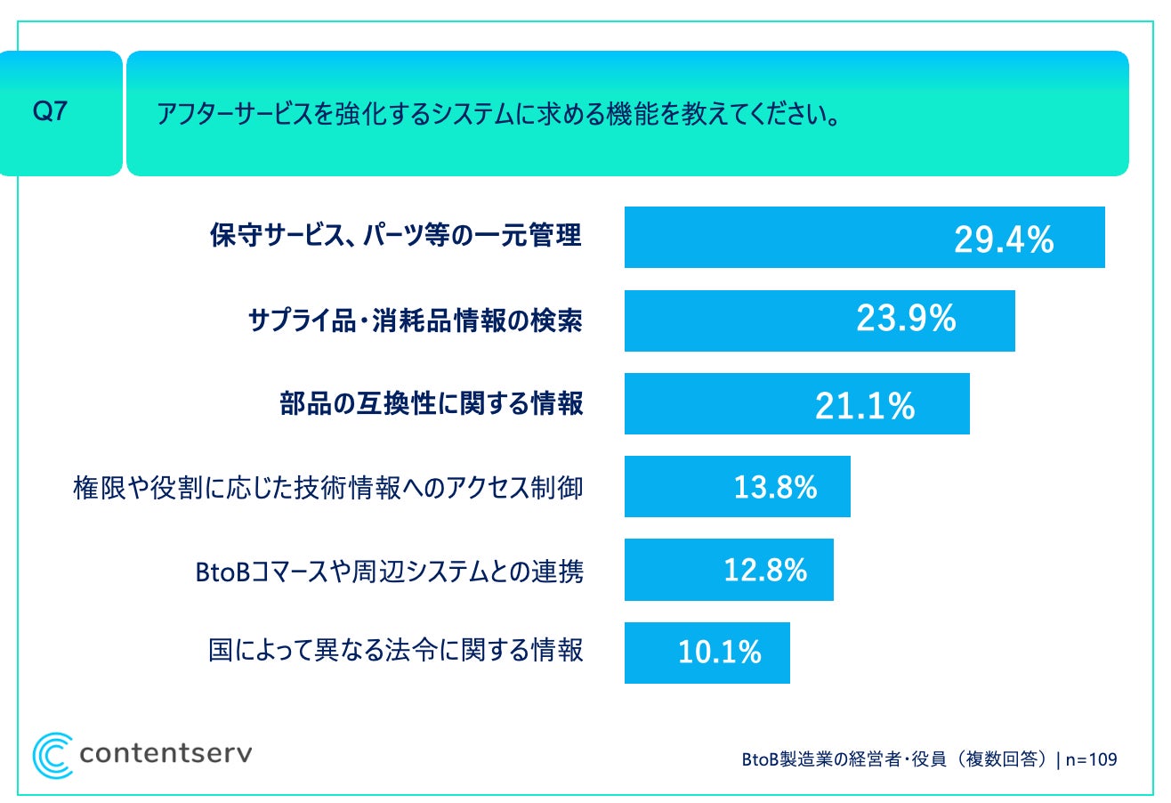 アフターサービスを強化するシステム要件について尋ねたところ、「保守サービスに必要な情報を一元管理できること、消耗品等の情報を検索し簡単に取得できると、代替部品や互換部品を容易に特定できること」などが上位になっています。