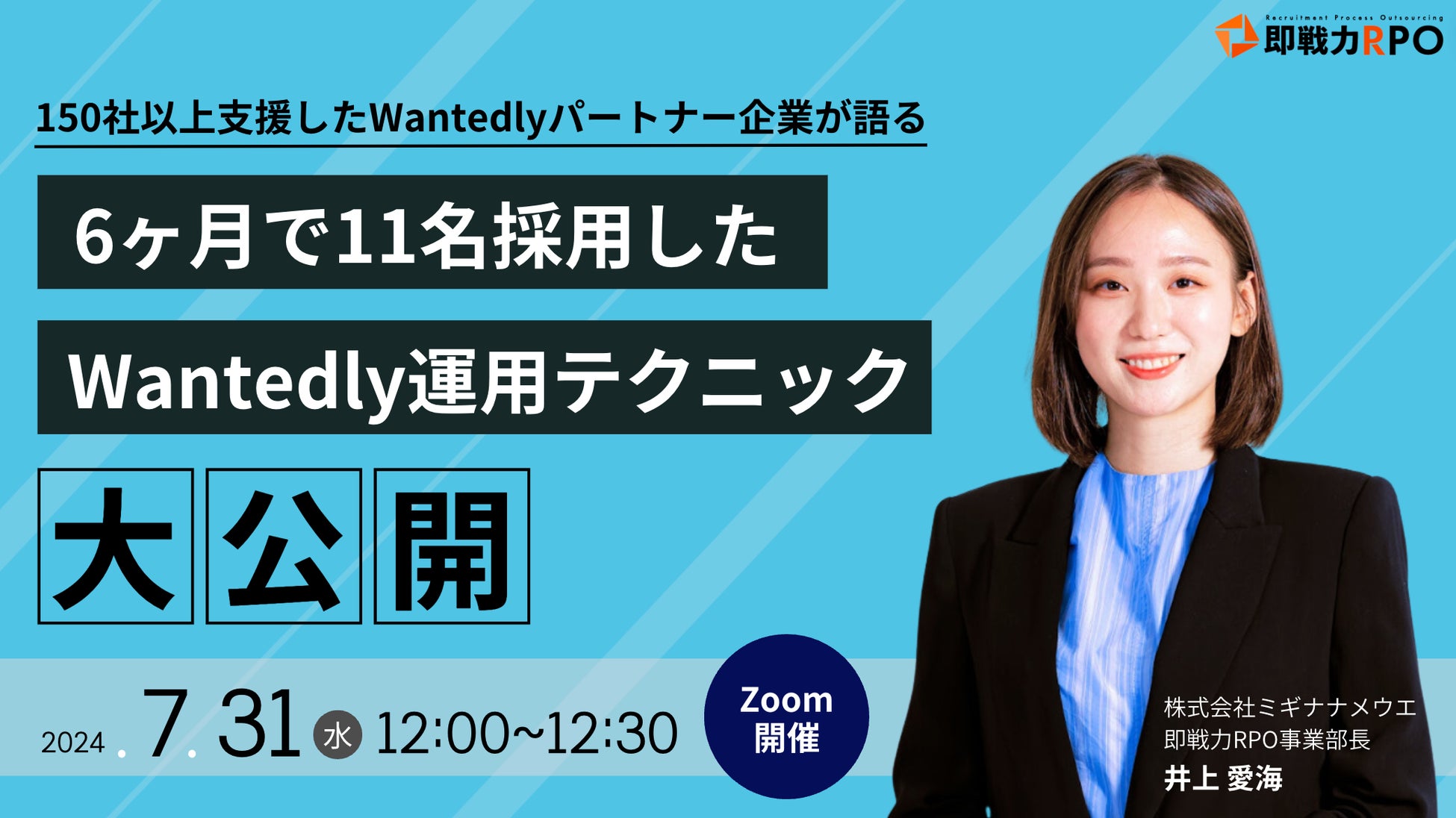 株式会社ミギナナメウエ(本社:東京都渋谷区、代表取締役CEO:古鍜冶 賢)は、2024年7月31日(水)に「公認パートナーが語る!結果につながるWantedly運用法を公開」のウェビナーを開催します。