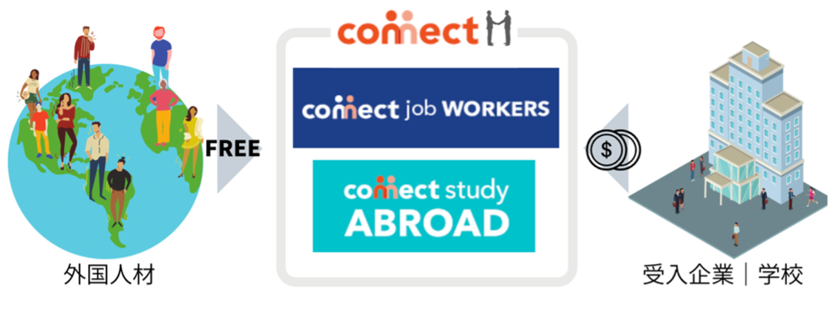 世界中の人材と企業を繋ぐ、国境を越えたグローバル採用支援事業を「Connect Job」のブランド名で展開。自社開発のデータベースには186の国と地域、累計約40万人の人材が登録しており、日本の大手グローバル企業、IT企業を中心に地方・中小企業まで約400 社との取引実績有り。2021年4月には特定技能向けオンラインマッチングプラットフォーム「Connect Job WORKERS」、11月には外国人留学生リクルーティングプラットフォーム「Connect Study ABROAD」を展開するなど、SaaS領域でもサービスを拡充しています。また、経済産業省・沖縄県・富山県・静岡県・長野県等、省庁・地方自治体からも事業を受託。雇用不足の国から人材不足が深刻な日本へ優秀な人材を迎え入れ、ビジネスの力で世界中の社会問題の解決に貢献します。