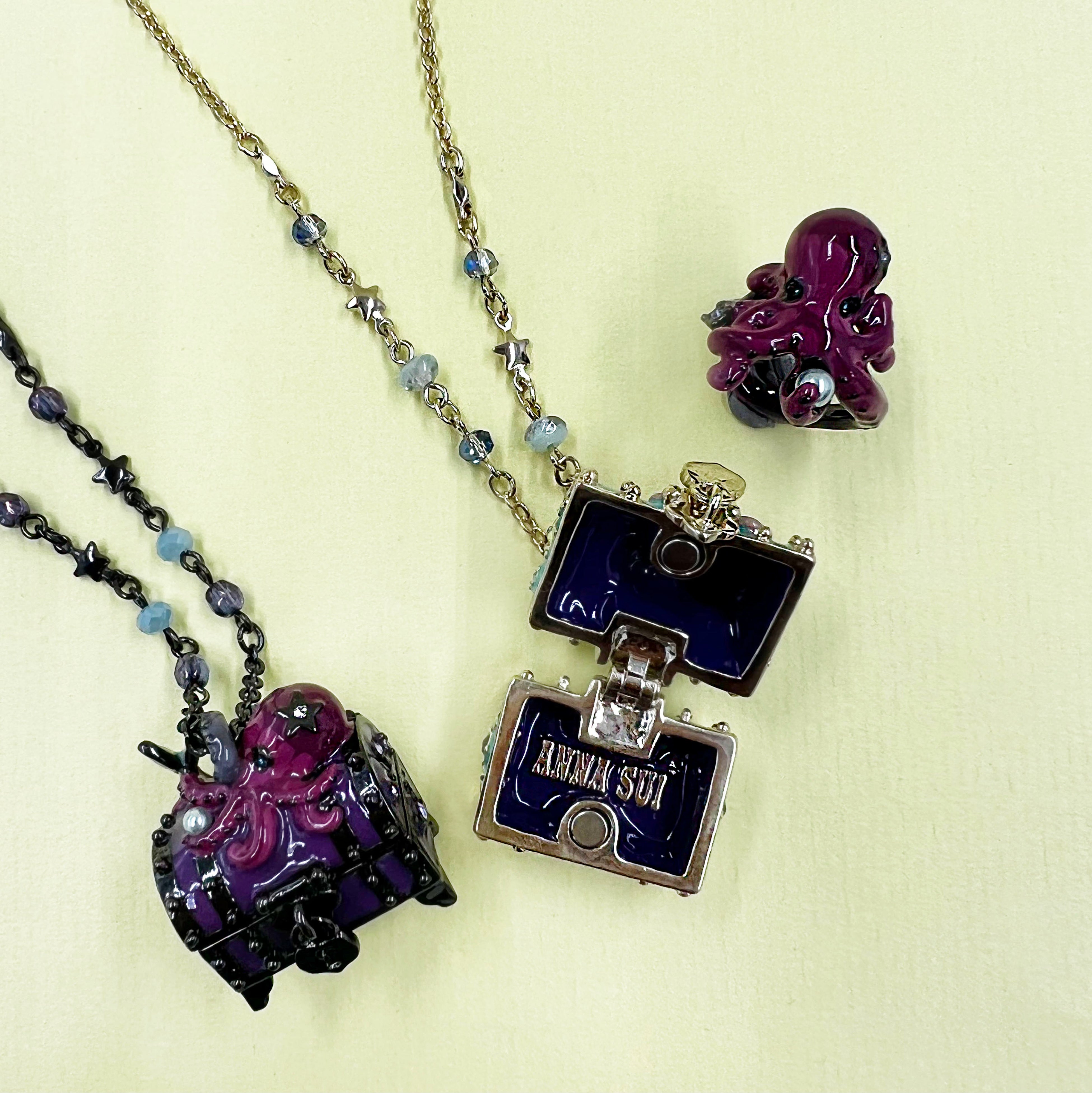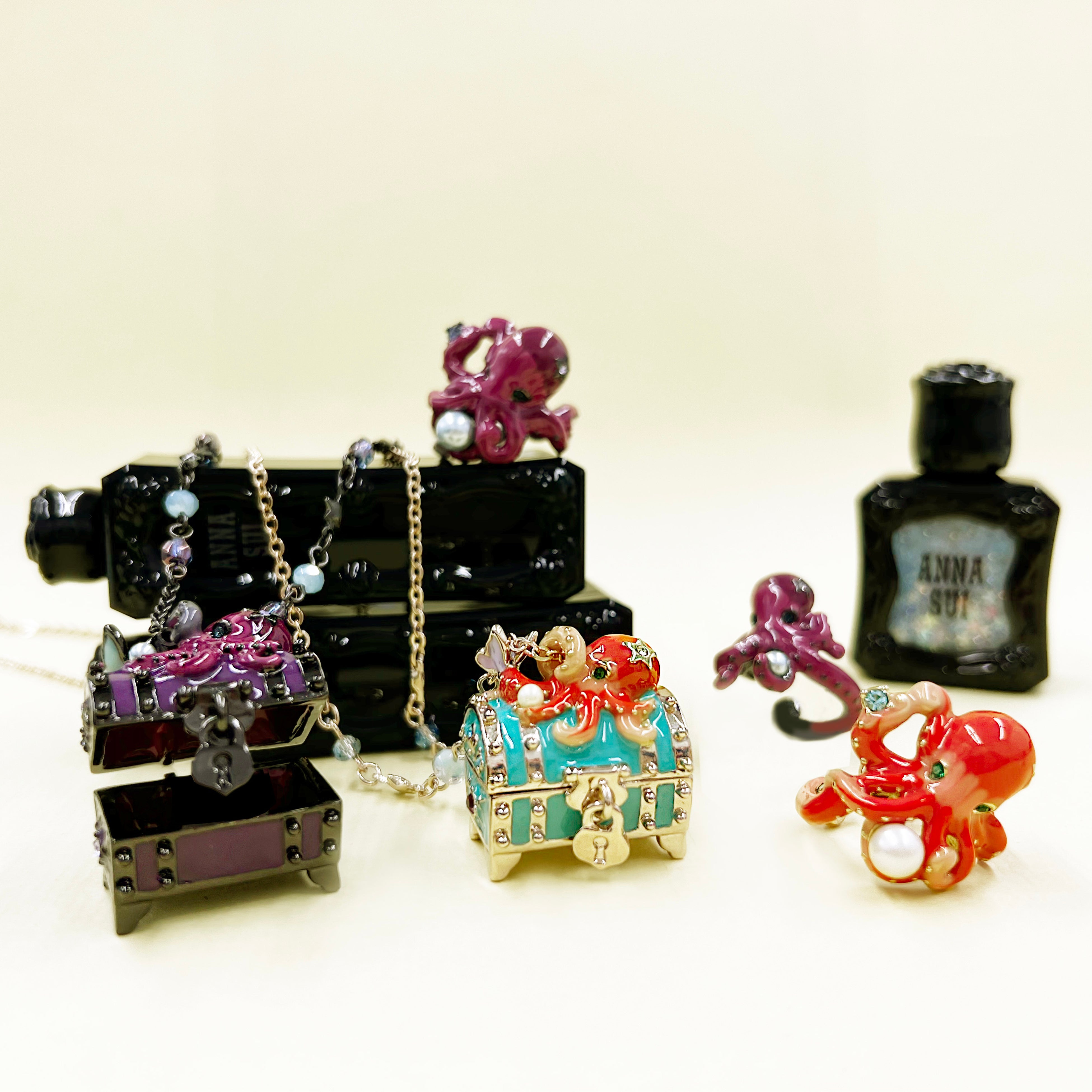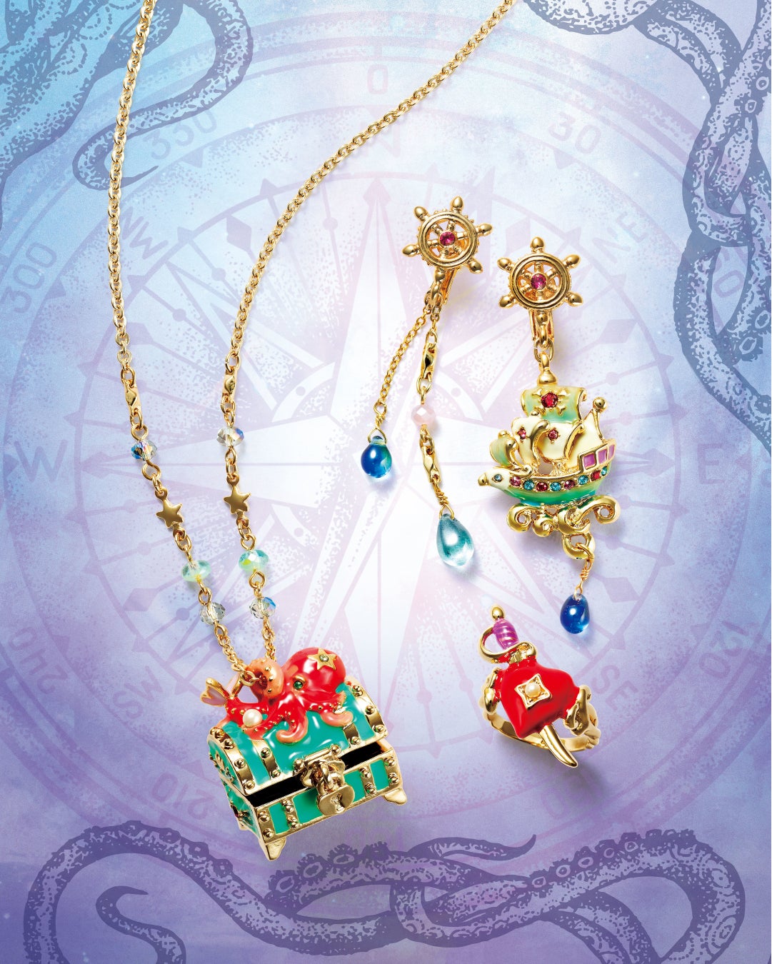 海底に眠る伝説の宝箱をモチーフにしたネックレスは、秘密のトレジャーを守っているキュートなタコと