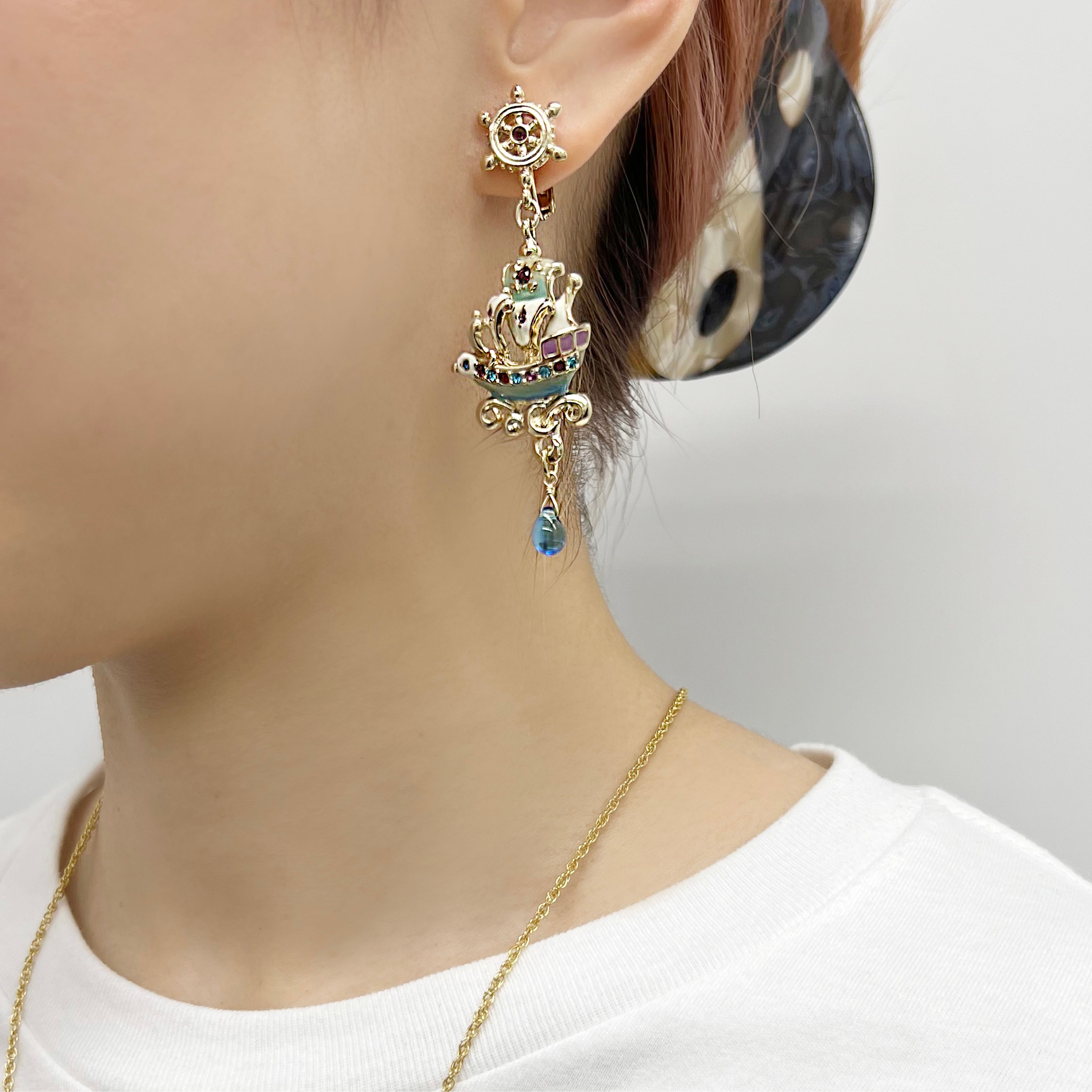 海賊船をイメージしたイヤーアイテムは、波しぶきをあげながら堂々と進む様子が立体的に表現されてい