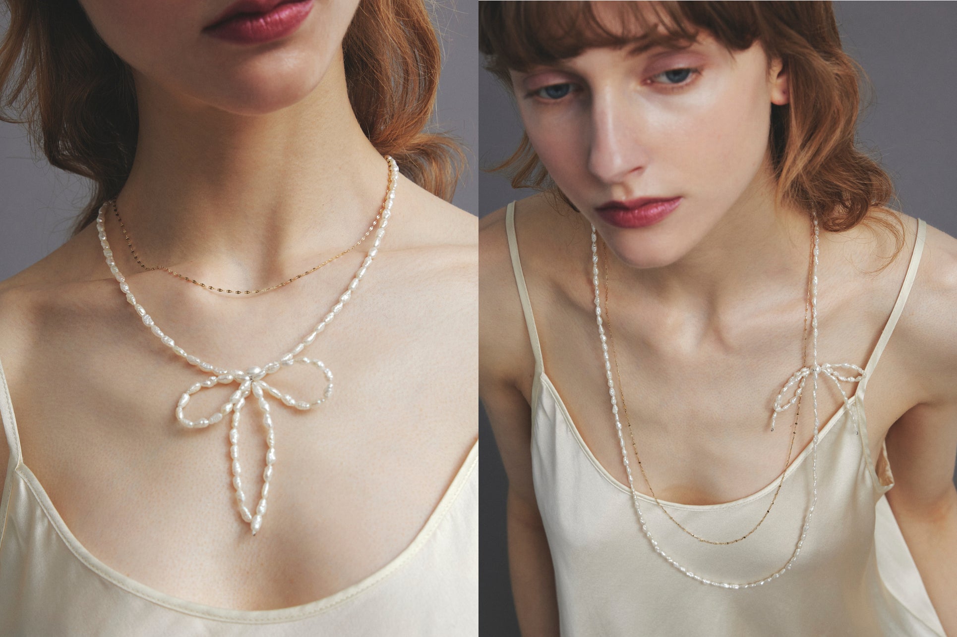 みずみずしい淡水パールとリボンモチーフを繋ぎ合わせ、リュクスな遊び心を叶えます。