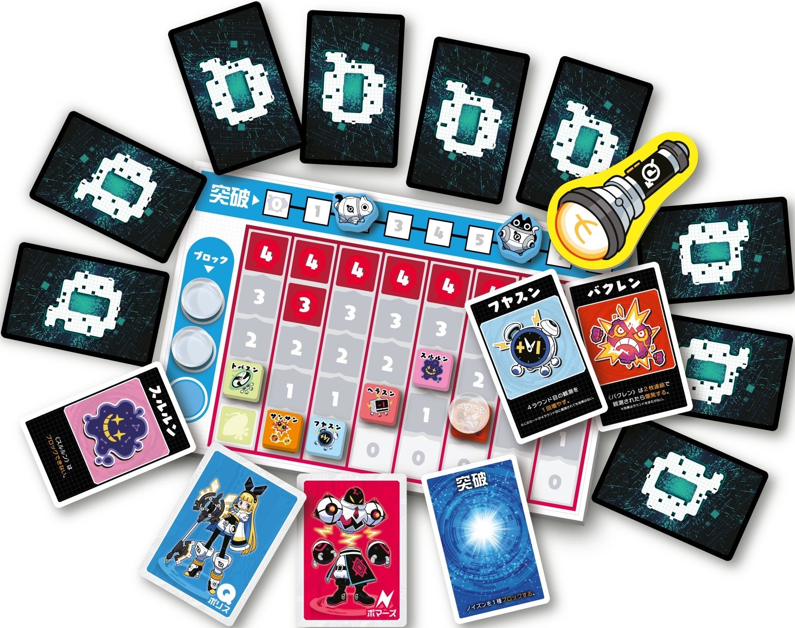 激しいノイズで敵味方がわからない中、1人が「観測者」となり、自分以外の手札を1枚めくります。Qポリス陣営は「突破カード」をすべてめくったら勝利、Nボマーズ陣営は「同種のノイズンカード」を4枚めくったら勝利です。「突破」や「ノイズン」には多種多様な効果があり、めくれたときに発動します。