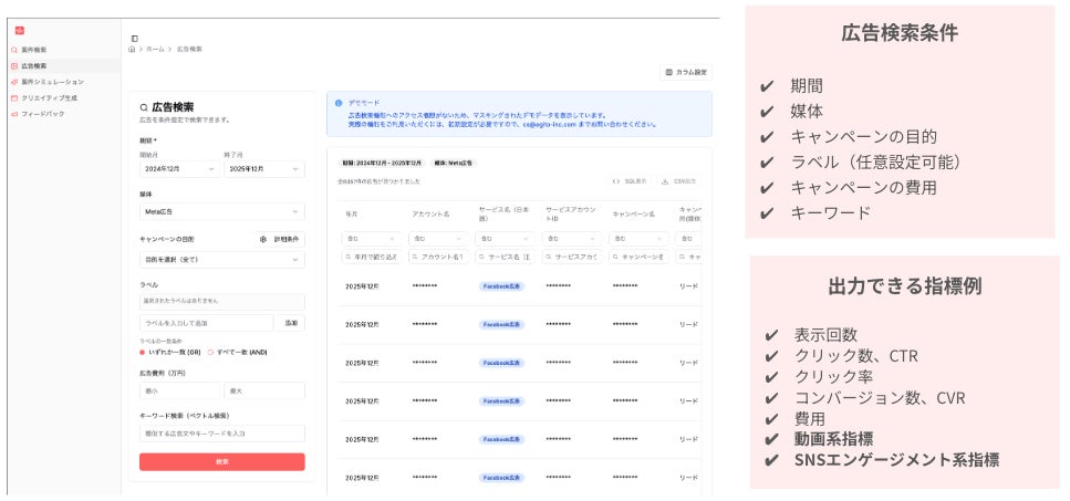 Databeat経由で活用企業のBigQueryに蓄積した広告データから、様々な条件を元にキャンペーン単位で案件データを検索できる機能です。