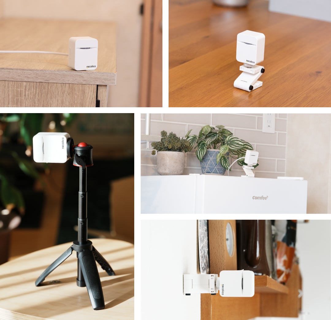 面倒な設定はありません。「まもりこ」アプリで契約したら、あとは設置して電源を繋ぐだけで見守りをスタートできます。専用スタンドや両面テープなどが同梱されているので設置も簡単です。また三脚で広く使用されている1/4インチネジに対応しているので、市販の固定具なども使用することができます。