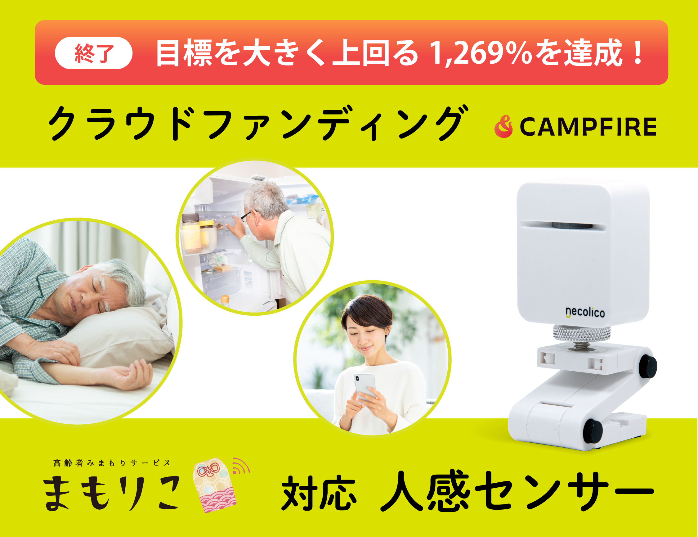 高齢者見守りサービスを全国展開する合同会社ネコリコ(本社:東京都千代田区、代表:山中泰介)は、2026年2月6日より実施しましたクラウドファンディング『高齢者みまもりサービス・まもりこ対応センサー「人感センサー」』は、当初の目標を大きく上回る1,269%を達成しました。また、リターン(商品)の出荷を4月上旬より開始いたします。