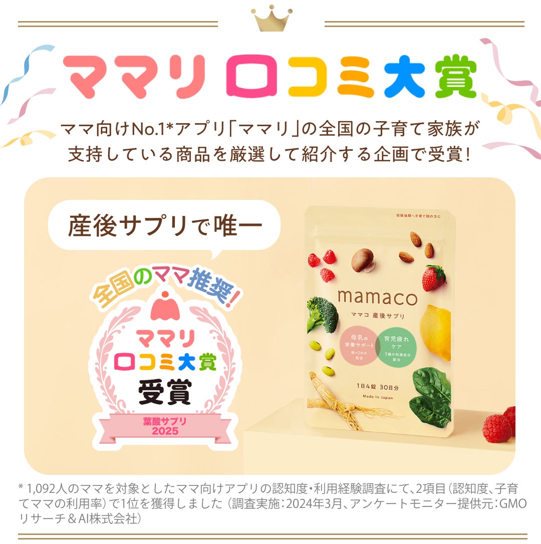 「ママリ口コミ大賞」は、ママ向けNo.1*アプリ「ママリ」の月間400万検索・110万投稿等のデータを独自のロジックで集計し、全国の子育て家族が支持している商品・サービスを厳選して紹介する企画です。このたび「葉酸サプリ部門」で受賞した「mamaco」は、産後でどうしても偏ってしまう栄養バランスを補える点や、各種販売サイトでの口コミ評価の高さを特に評価いただき、産後期特化のサプリメントでママリ口コミ大賞史上初となる受賞獲得に至りました。