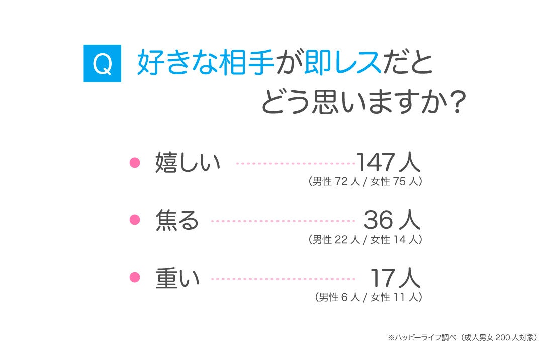 さまざまな意見が飛び交いましたが、男女とも好きな相手が即レスしてくれたら「嬉しい」と思うのが本音です。