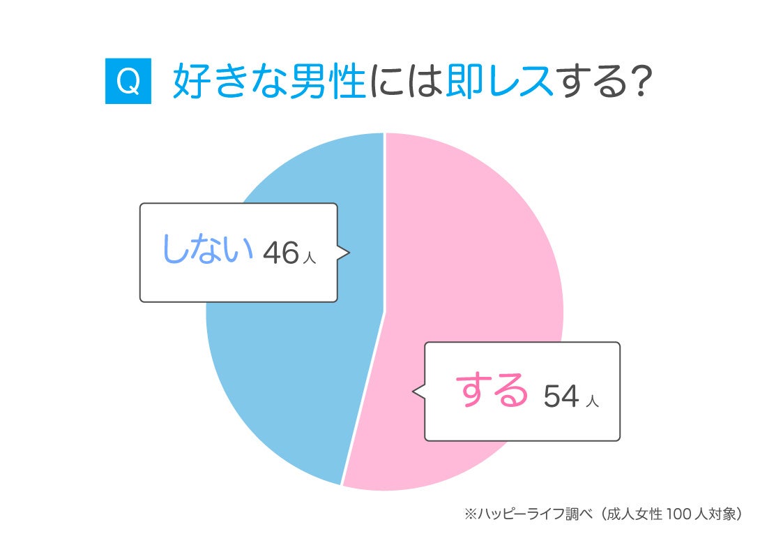 一方で、好きな男性には即レスする率が54%と、興味がない男性に即レスしない女性から25%もの人が気持ちに変化があるようです。