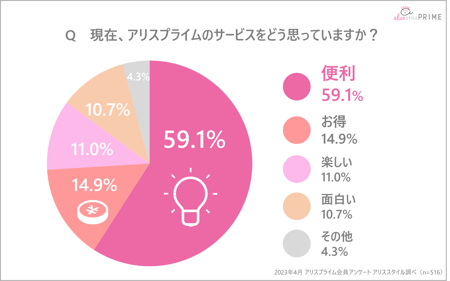 「アリスプライムのサービスをどう思っていますか?」という設問では、59.1%の方が「便利」であると回答。次いで「お得」「楽しい」「面白い」と続きました。