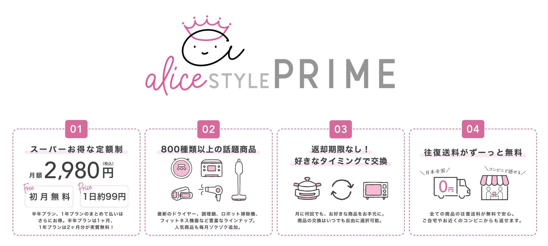 「アリスプライム」は話題の最新家電や美容家電など800種類以上の商品が、月額2,980円(税込)で自由にご利用いただける定額制シェアリングサービスです。旅行用品や季節家電など使用時期が限られているモノはもちろん、高級家電や話題の最新家電もレンタルでご利用いただけます。レンタル中に気に入ったモノは購入も可能です。レンタル予約や発送連絡など、全ての取引はサービス内で完結。商品には物損・盗難等の保険を適用するなど、利用者が安心して取引できる環境を構築しています。