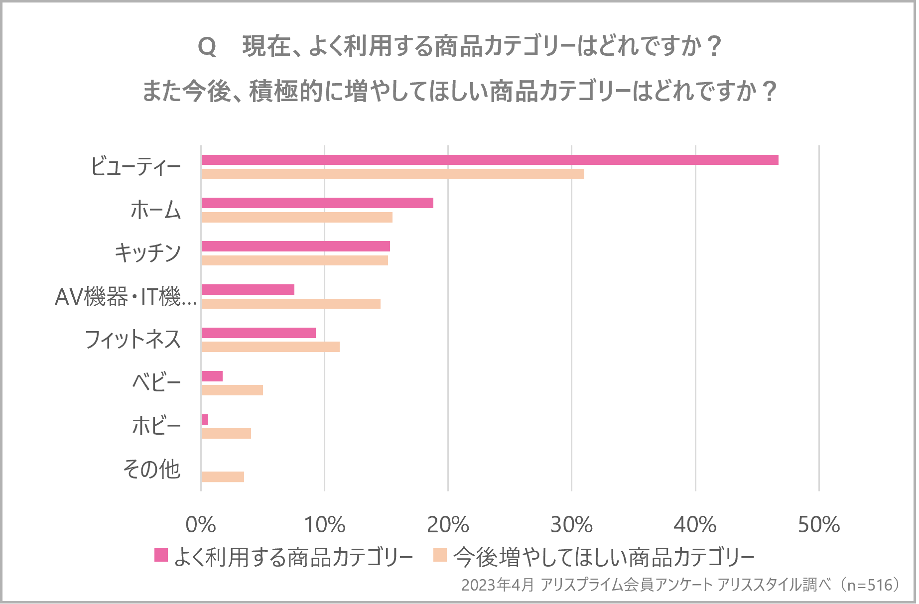 また「今後増やしてほしい商品カテゴリーはどれですか?」という設問については、最も回答を多く集めたのは同じく「ビューティー」でしたが、そのスコアを落とし、代わって伸長したのは「AV機器・IT機器」や「フィットネス」というカテゴリーでした。これは、近年のDXやVRといったトレンドの高まりや、(調査当時の)コロナ禍の巣ごもり需要などの世相を反映したものとみられます。