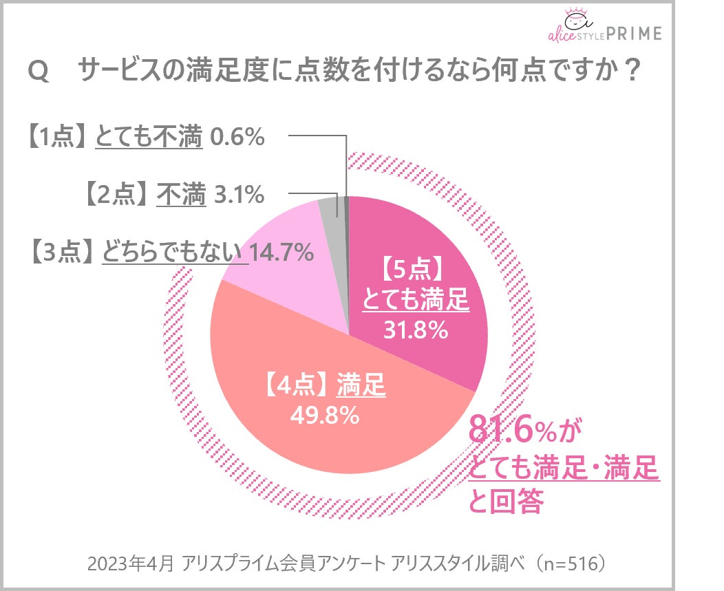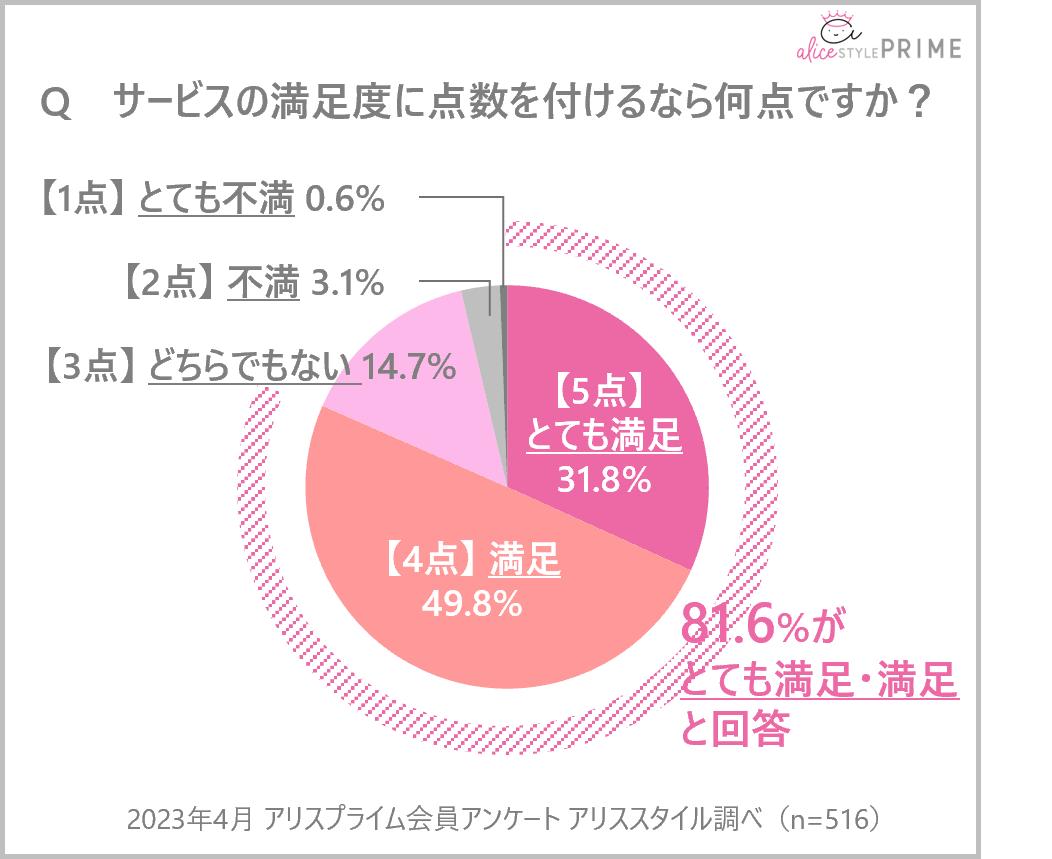 アリスプライムの満足度を調査する設問では、「とても満足31.8%」「満足49.8%」となり多くのユーザーの