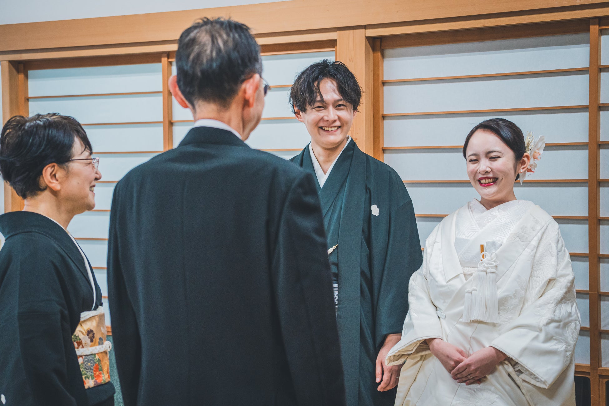 ご自宅やご親族宅で挙式・会食を行う「家婚式」でも、INAI WEDDING WASOUの出張ヘアメイク&着付けサービスなら移動の手間なく本格的な準備が可能。花嫁・花婿のお支度は約60〜90分で完了し、撮影アテンドが同行するためリビングや庭先、思い出の部屋など空間を活かした自然なショットが残せます。交通費込みの定額プランで追加費用の心配もなく、大阪スタジオにて準備や撮影までを行なってから会場に向かうなども可能です。