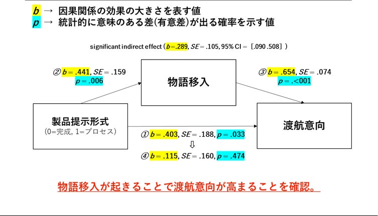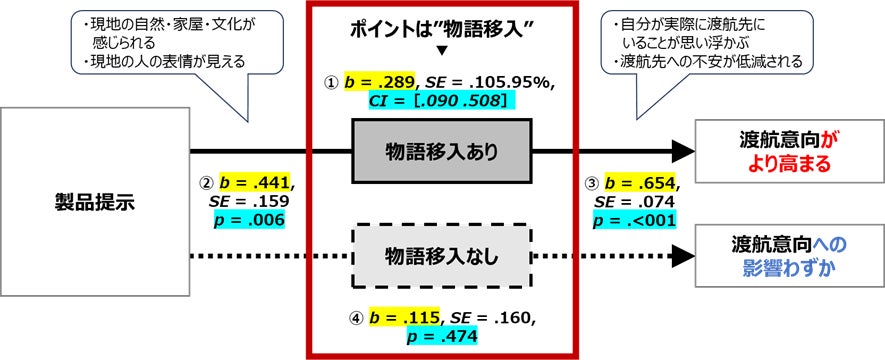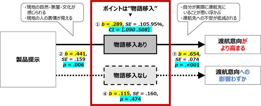 製品の提示によって“物語移入”が起こると地域への渡航意欲が高まった結果が確認され、同時に“物語移入”が起こらない場合、渡航意欲の高まりも見られなかった結果となりました。このことから、製品の提示によって渡航意欲が高める、“物語移入”がそのファクターになることが判りました。