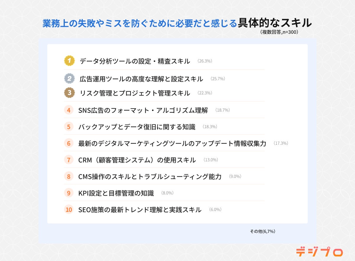 調査結果から、ミスを防ぐために最も重要とされるスキルは、ツールやシステムの設定精度を高めるスキルであることがわかりました。特に、データ分析ツールや広告運用ツールの高度な理解が求められており、これらは「データベースの更新エラー」や「デジタル広告の配信設定ミス」といった失敗に直結するためです。さらに、リスク管理やプロジェクト管理スキルも、業務の効率化とミスの未然防止に役立つことが示唆されます。