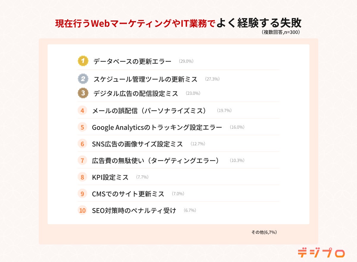 1位に「データベースの更新エラー(29.0%)」、2位に「スケジュール管理ツールの更新ミス(27.3%)、3位に「デジタル広告の配信設定ミス(21.0%)」が選ばれました。