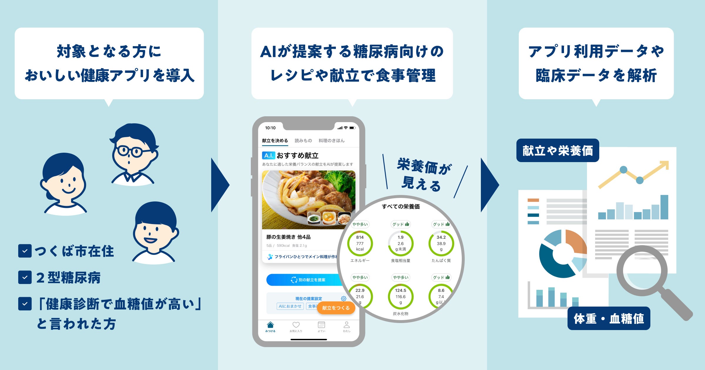 本研究では、筑波大学附属病院の外来患者、つくば市の協力を得て、つくば市にお住まいで糖尿病を治療中の方がご参加いただけます。研究参加者は3ヶ月の間、可能な範囲にて、おいしい健康アプリ内のAIが提案する糖尿病向けレシピや献立を召し上がっていただきます。その後、食事傾向を示すアプリ利用データおよび血糖値・体重といった臨床データを組み合わせ、解析を行います。