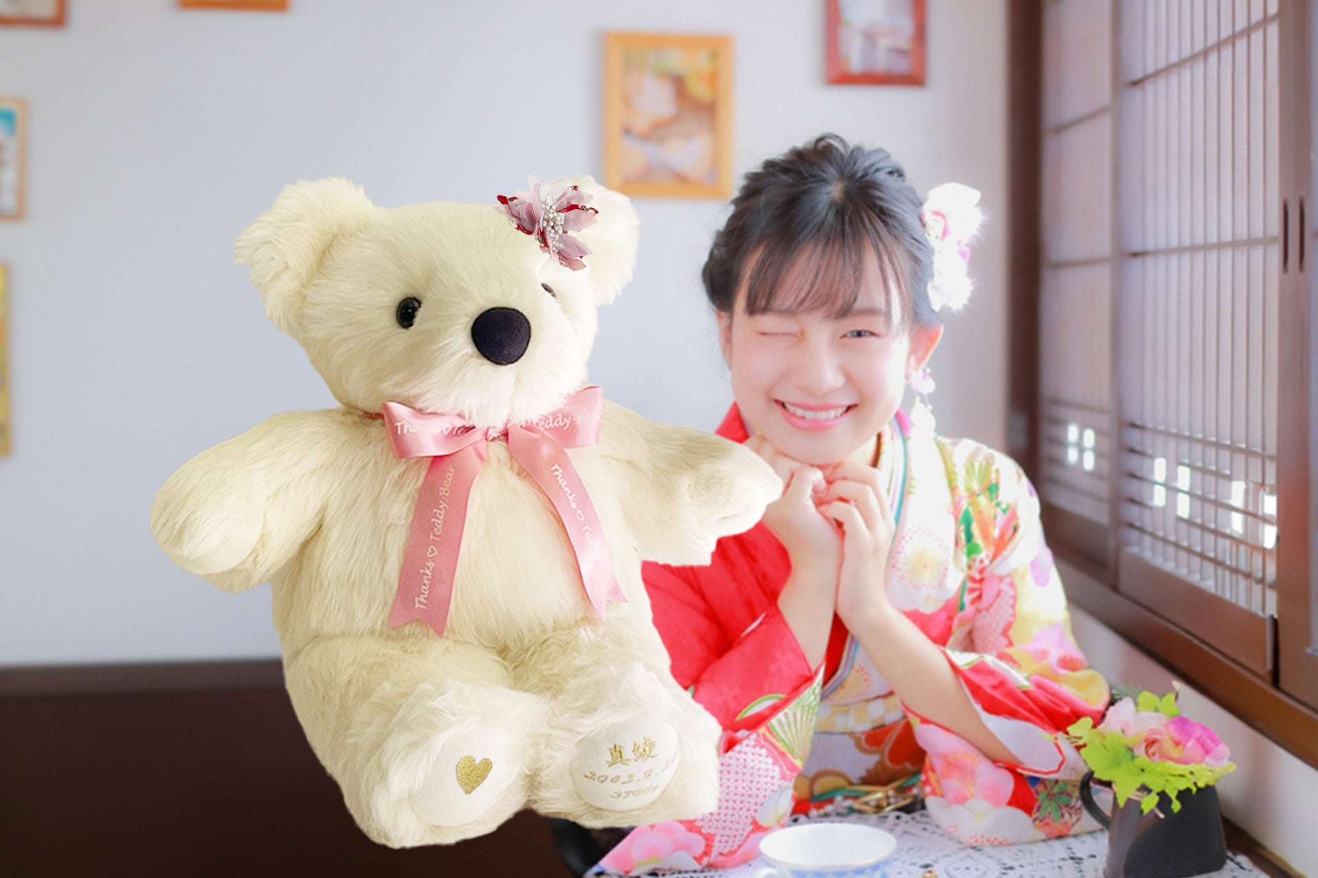 成人の日に、20年前の私を逆プレゼントでサプライズ!生まれた時の重さで作るテディベアに感謝のメッセージを刺繍して、ママ・パパに贈ります。「2025 新成人お祝いセット」12月1日(大安)受付開始