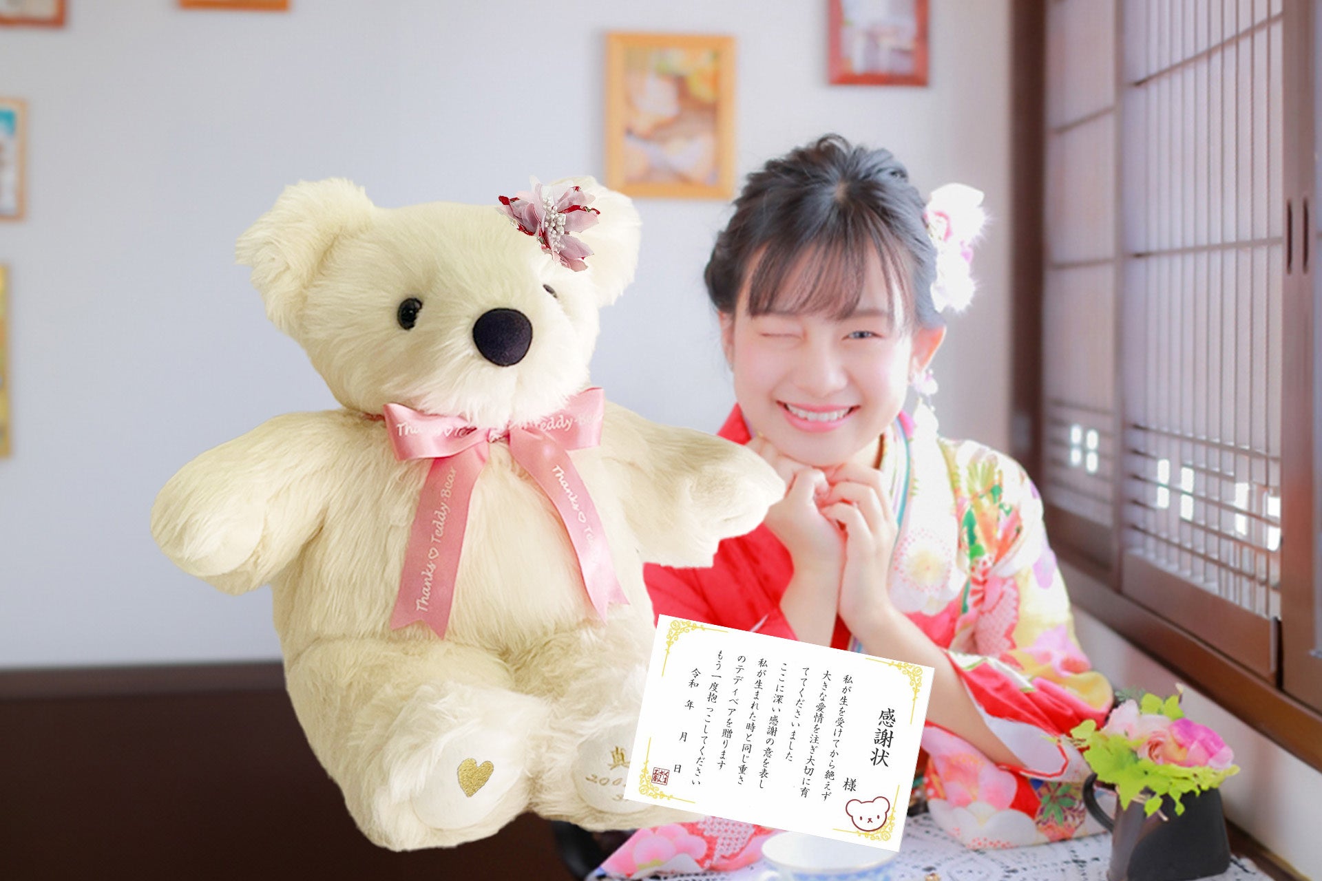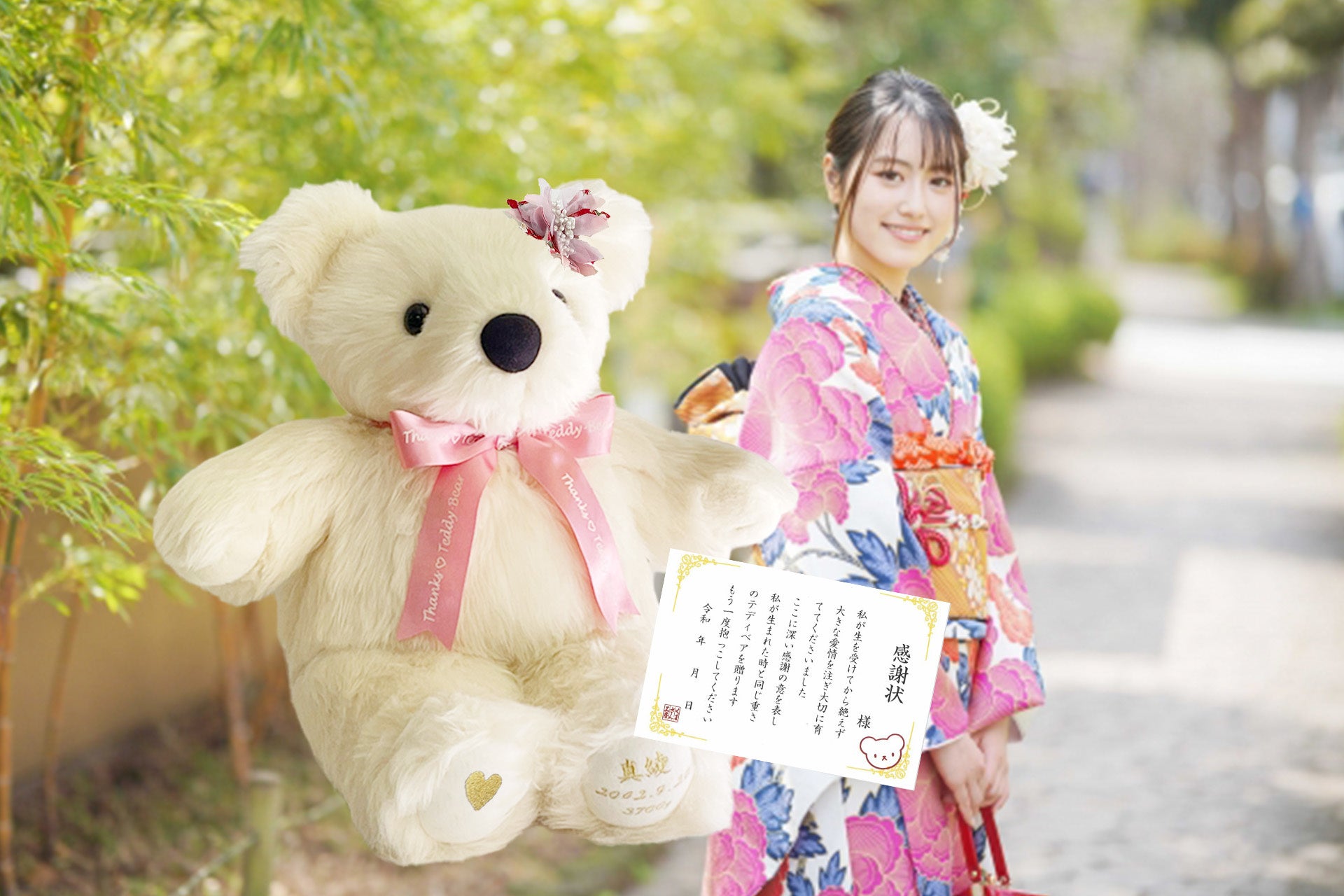 新成人の皆さまのそんな思いを叶えるため、くまさん工房では「体重ベア」の魅力を追求し続けています。「2024 新成人お祝いセット」でご好評いただいた「感謝状」も、引き続き「2025 新成人お祝いセット」にご用意。ご両親さまにとっても′04(ゼロヨン)新成人の皆さまにとっても特別なギフトとなるよう、お手伝いをいたします。