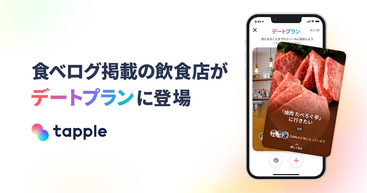 株式会社タップル(本社:東京都渋谷区、代表取締役社長:飯塚勇太)は、運営するマッチングアプリ「タップル」において、2022年8月9日(火)より、レストラン検索・予約サイト「食べログ」掲載の飲食店データを活用した 「デートプラン」の提供を開始いたしました。